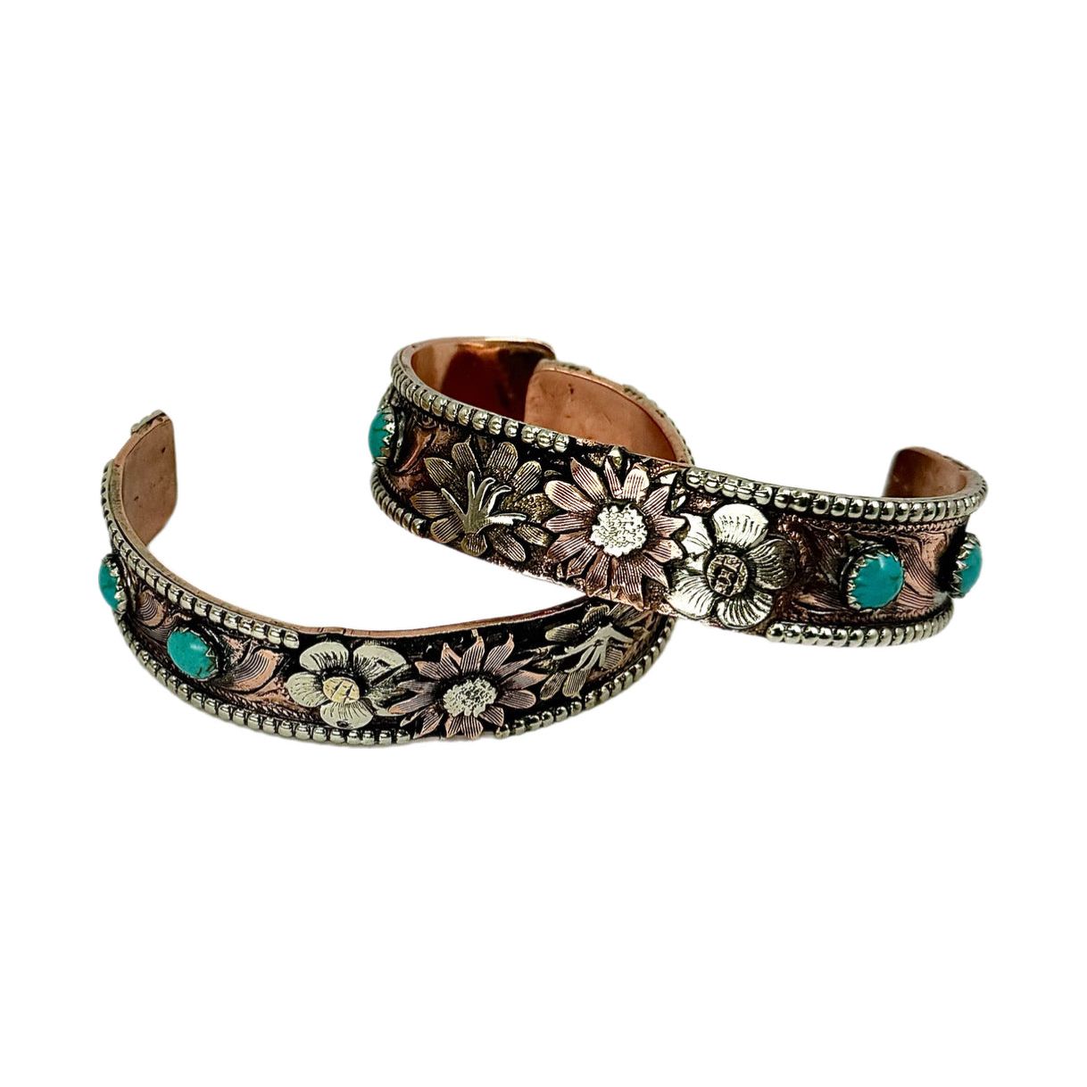 The Clementine Traditional Bracelet is a stunning handmade accessory, featuring 100% unique turquoise stones and intricate copper details. This western-inspired fashion piece embodies a spirit of adventure and elegance, perfect for any cowgirl looking to add a touch of charm to her style.