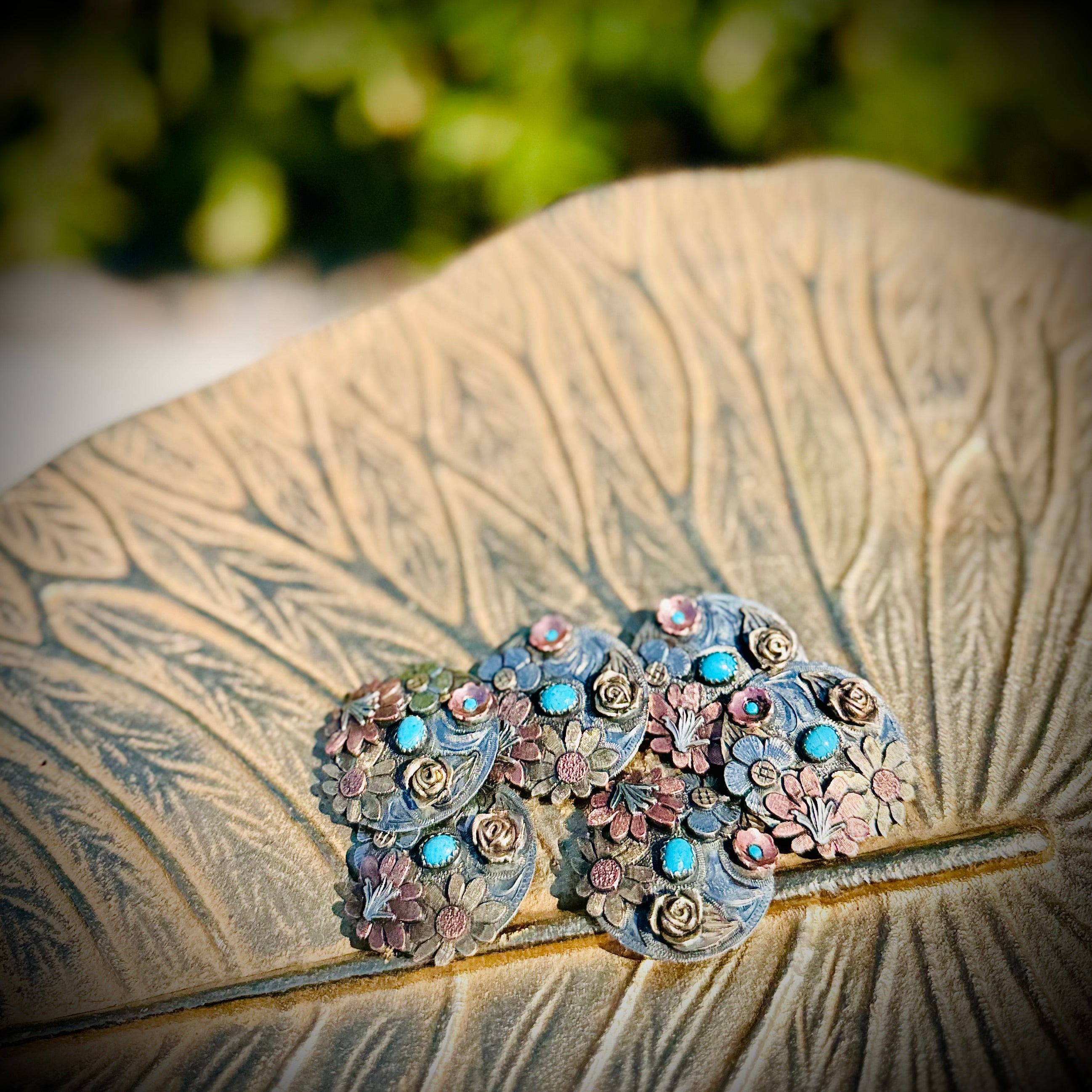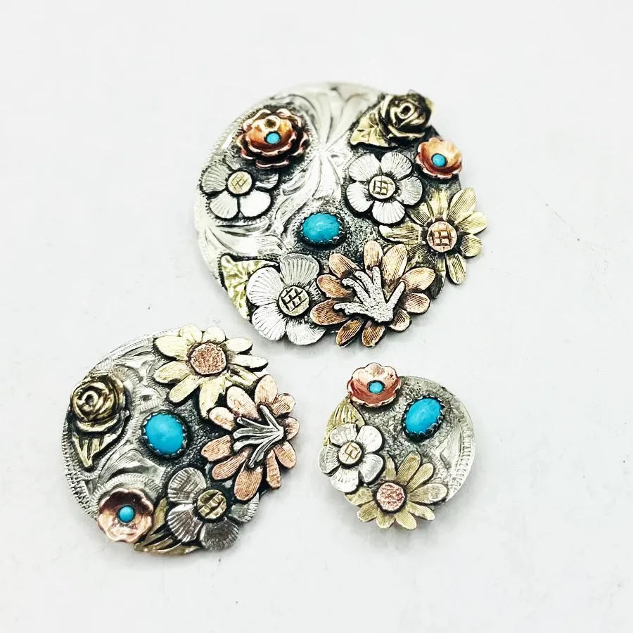 The Round Bouquet Conchos are a stunning blend of western style and handcrafted elegance. Each piece features intricate floral engravings and is made from quality silver and copper, adorned with turquoise stones for that perfect pop of color. These 100% unique embellishments elevate any fashion accessory with their captivating details. Perfect for personalized projects, they embody individuality and creativity, making them a must-have for any collection. Add a touch of charm to your leather goods and express your unique style with these exquisite conchos. Don't miss out on enhancing your wardrobe; get your Round Bouquet Conchos today!