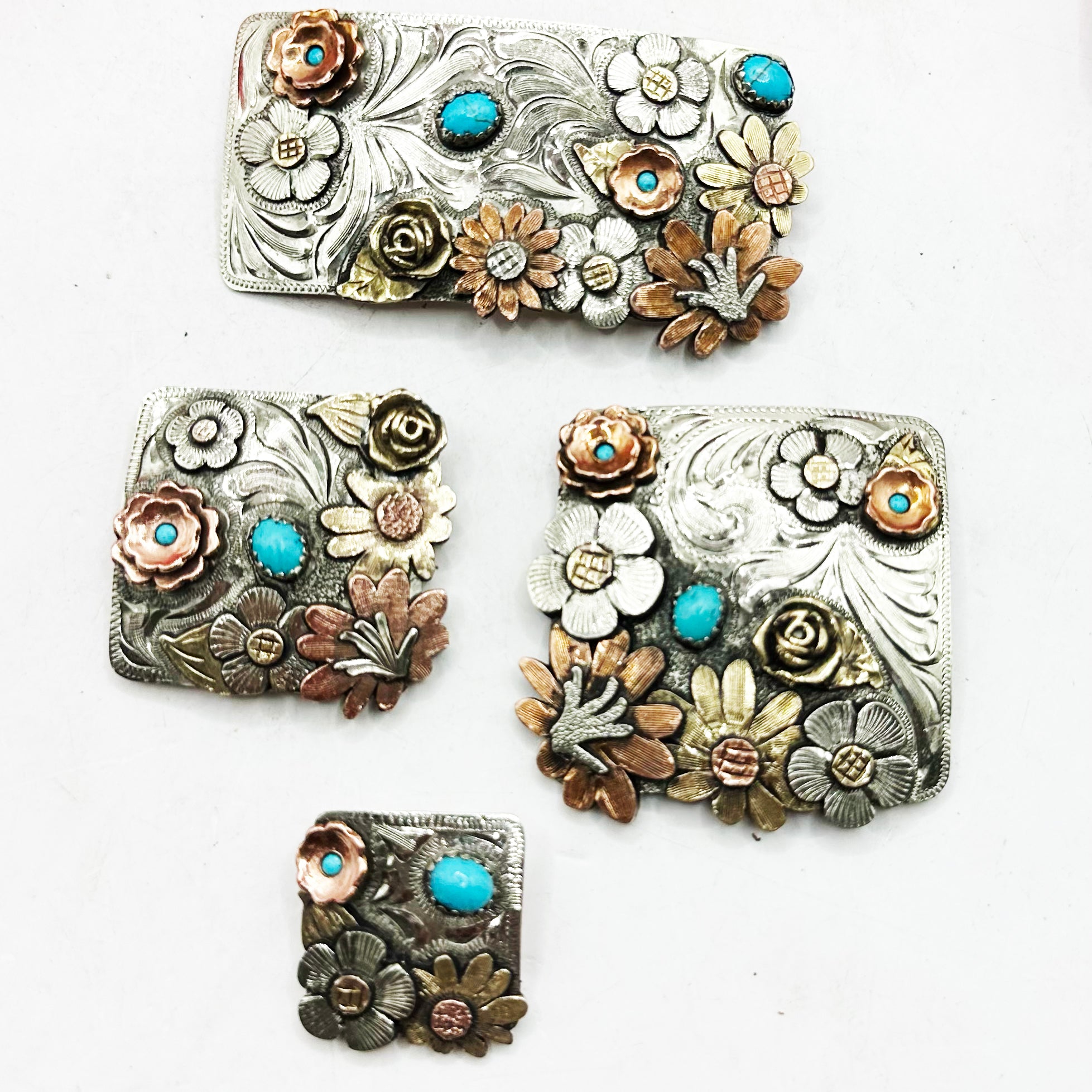 Discover our stunning Square Bouquet Conchos, handmade with intricate details and 100% unique designs. Featuring beautiful turquoise stones and elegant engravings, these fashion-forward embellishments in silver and copper add a western flair to any outfit. Elevate your accessory game with this custom piece that exudes sophistication.
