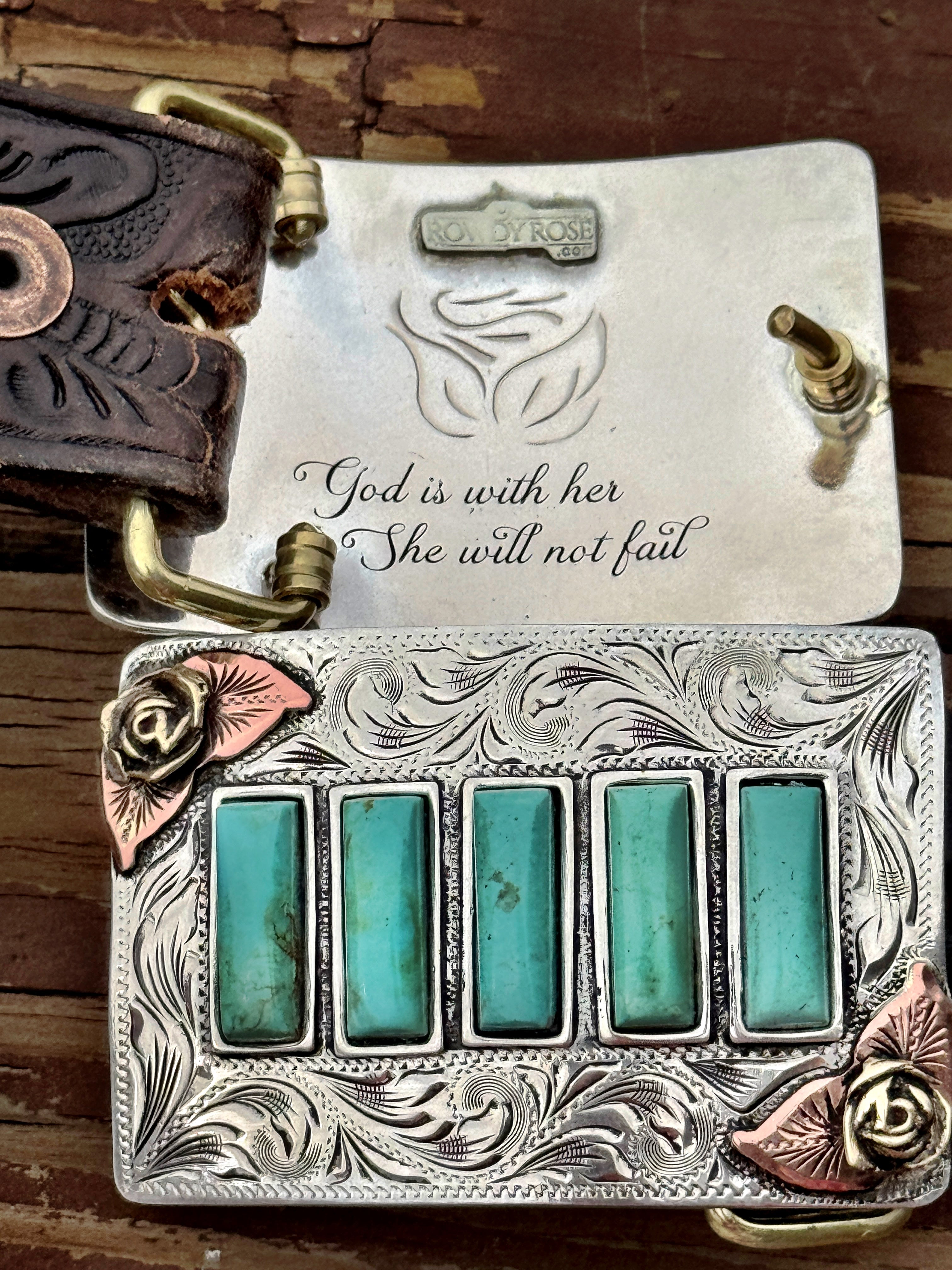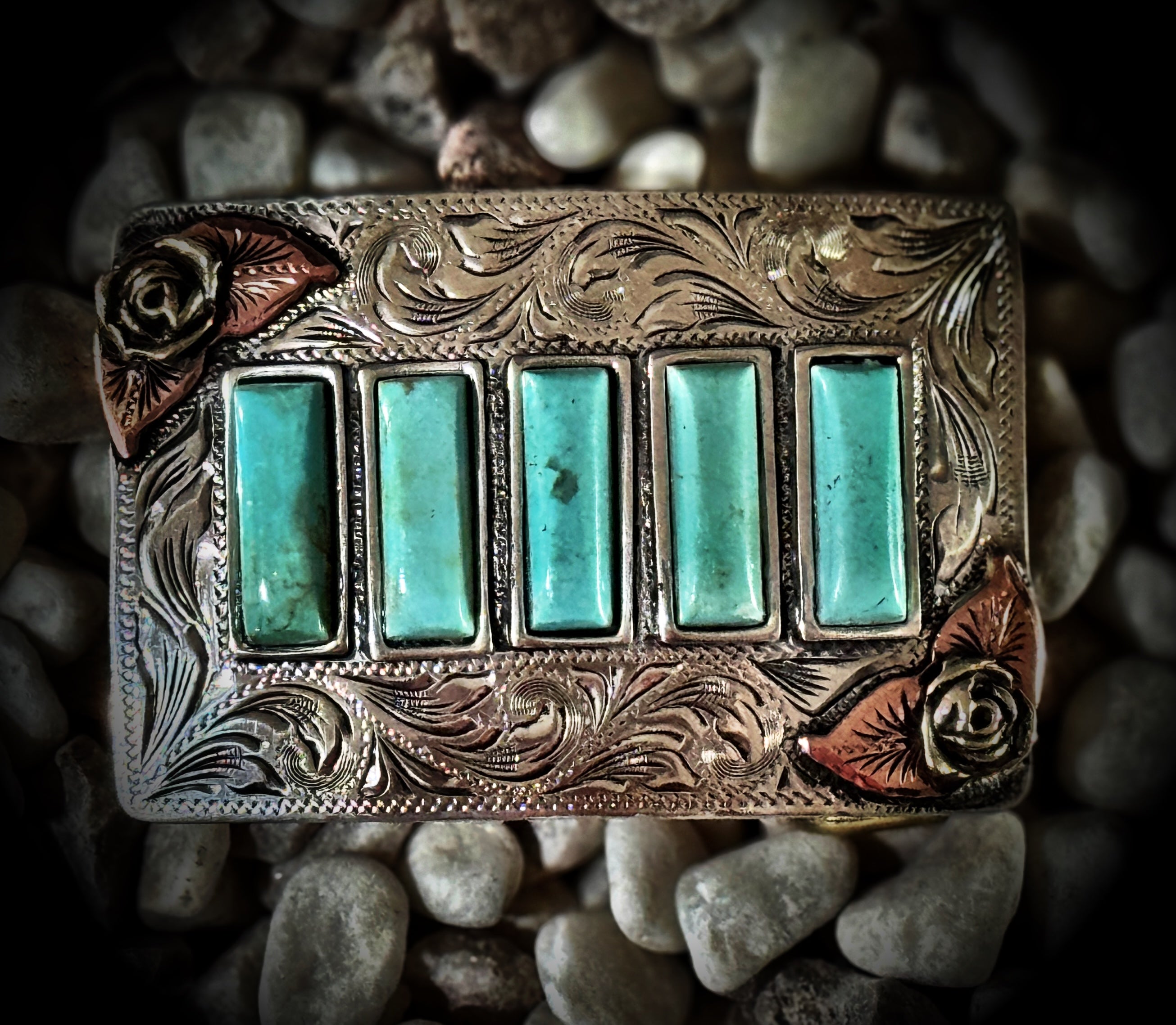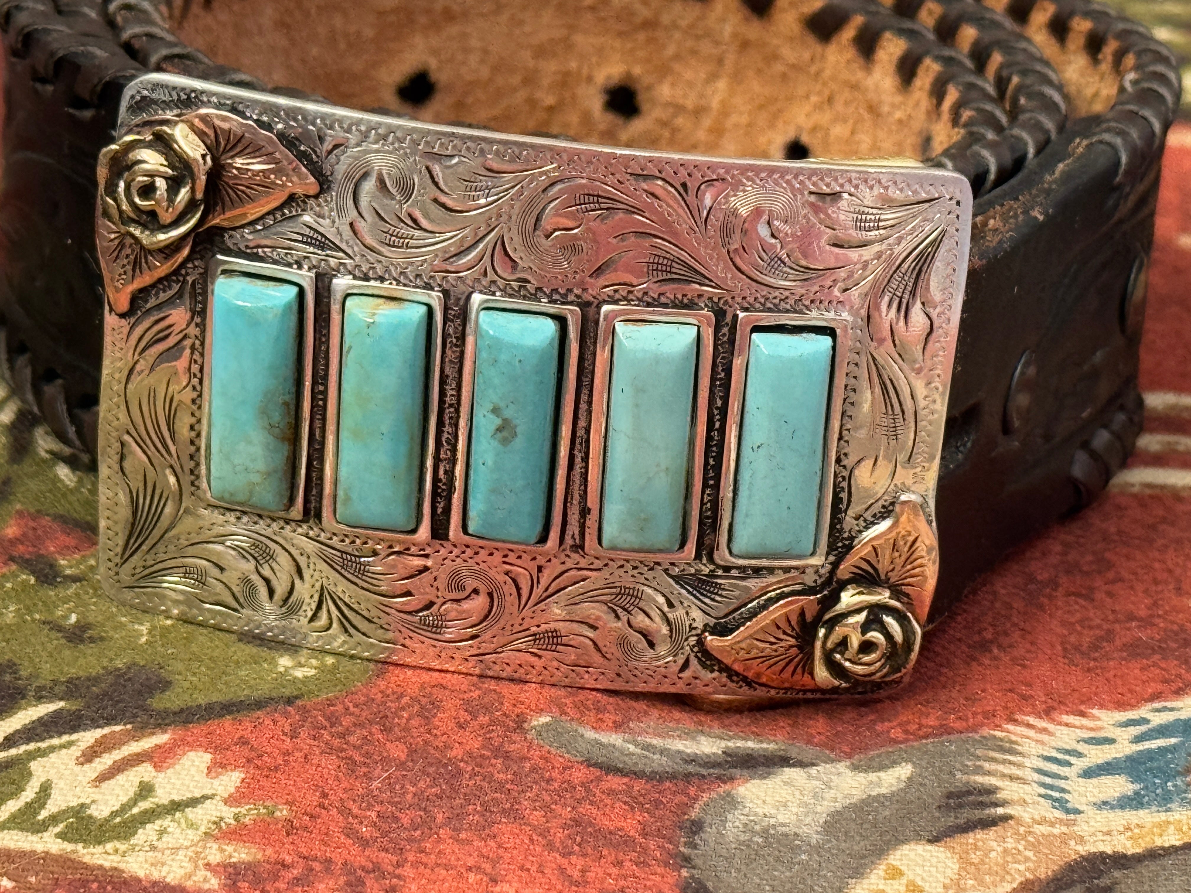 Elevate your style with this stunning handmade Turquoise Belt Buckle, featuring vibrant turquoise stones with copper and gold roses and intricate silver details. Each 100% unique buckle is custom-crafted, adding a fashionable western flair to your outfit. With beautiful engravings and embellishments, it’s the perfect accessory for any occasion.