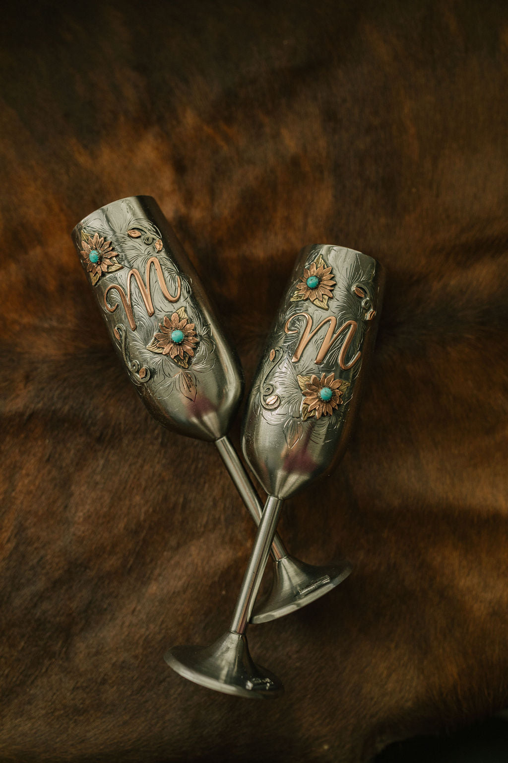 Discover our exquisite Champagne Flutes Style 10, a flawless blend of elegance and western charm. Each flute is handmade, featuring intricate details and unique embellishments. Embrace the fashion-forward design, complemented by beautiful turquoise stones and customizable engraving options. Celebrate your special moments with these 100% unique, timeless pieces.