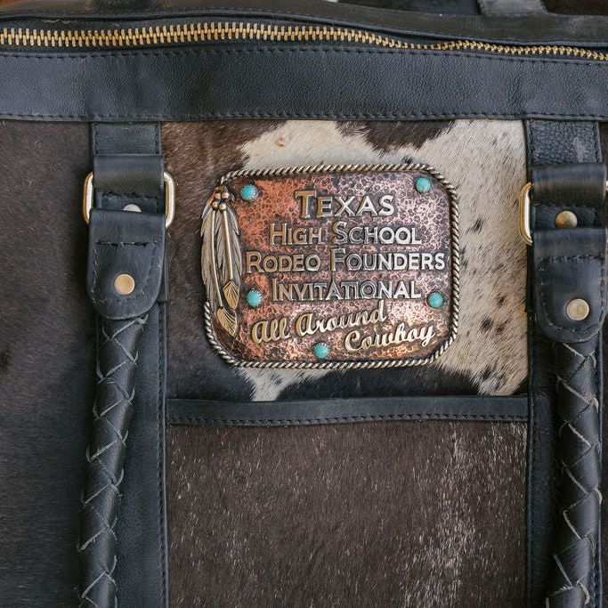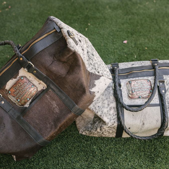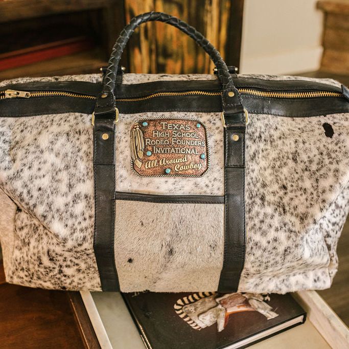 Our Custom Buckle Duffels are always a contestant favorite! Duffels come in a variety of cowhide colors (no two are the same!). You can choose an existing buckle style (click here to view buckle styles) or we can make a custom buckle design to your exact specifications!