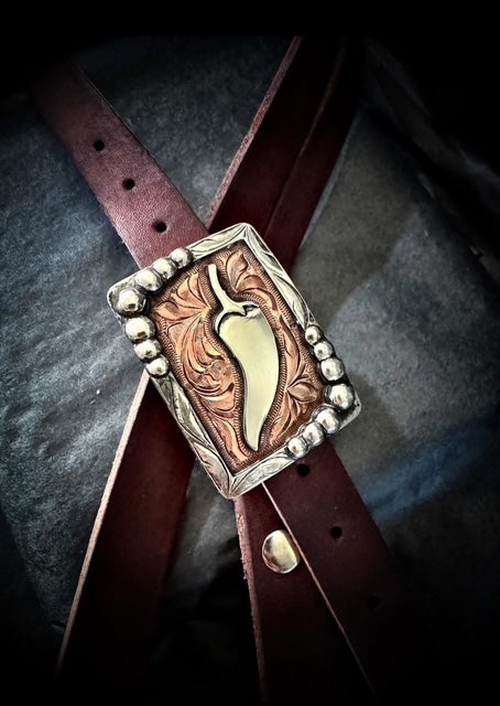 Discover the Flat Face Chili Headstall buckle a stunning blend of western charm and modern fashion. This handmade, custom-designed headstall buckle features exquisite details, turquoise stones, and unique engraving options. Crafted from durable silver and copper, it's a 100% unique statement piece you'll cherish forever. Elevate your style today!