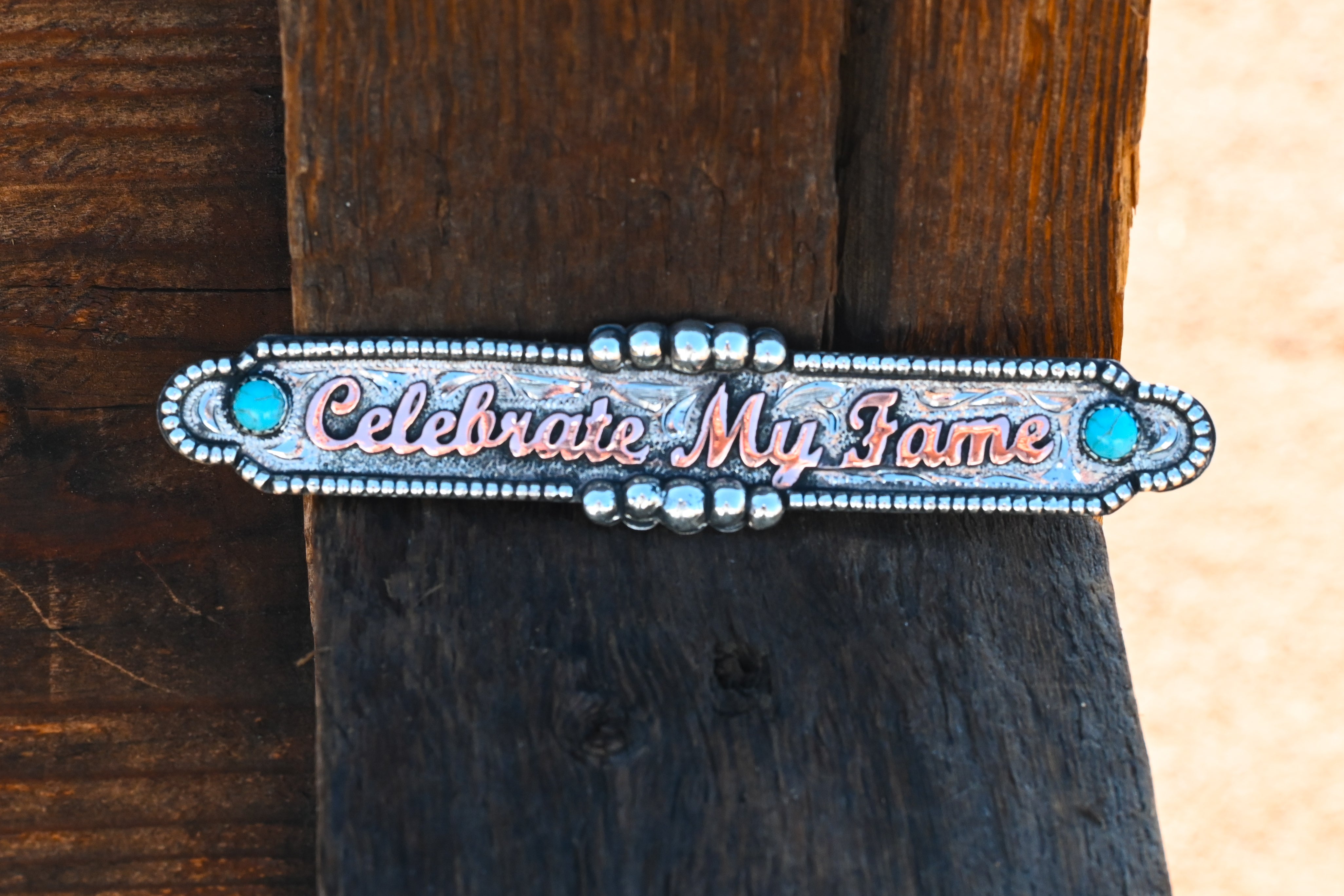 Elevate your style with the Halter Plate Style 04, a 100% unique handmade western accessory that showcases vibrant turquoise stones and exquisite silver and copper details. Customizable with personalized engraving, this fashion piece is perfect for those who love custom embellishments. Make a statement with this one-of-a-kind accessory!