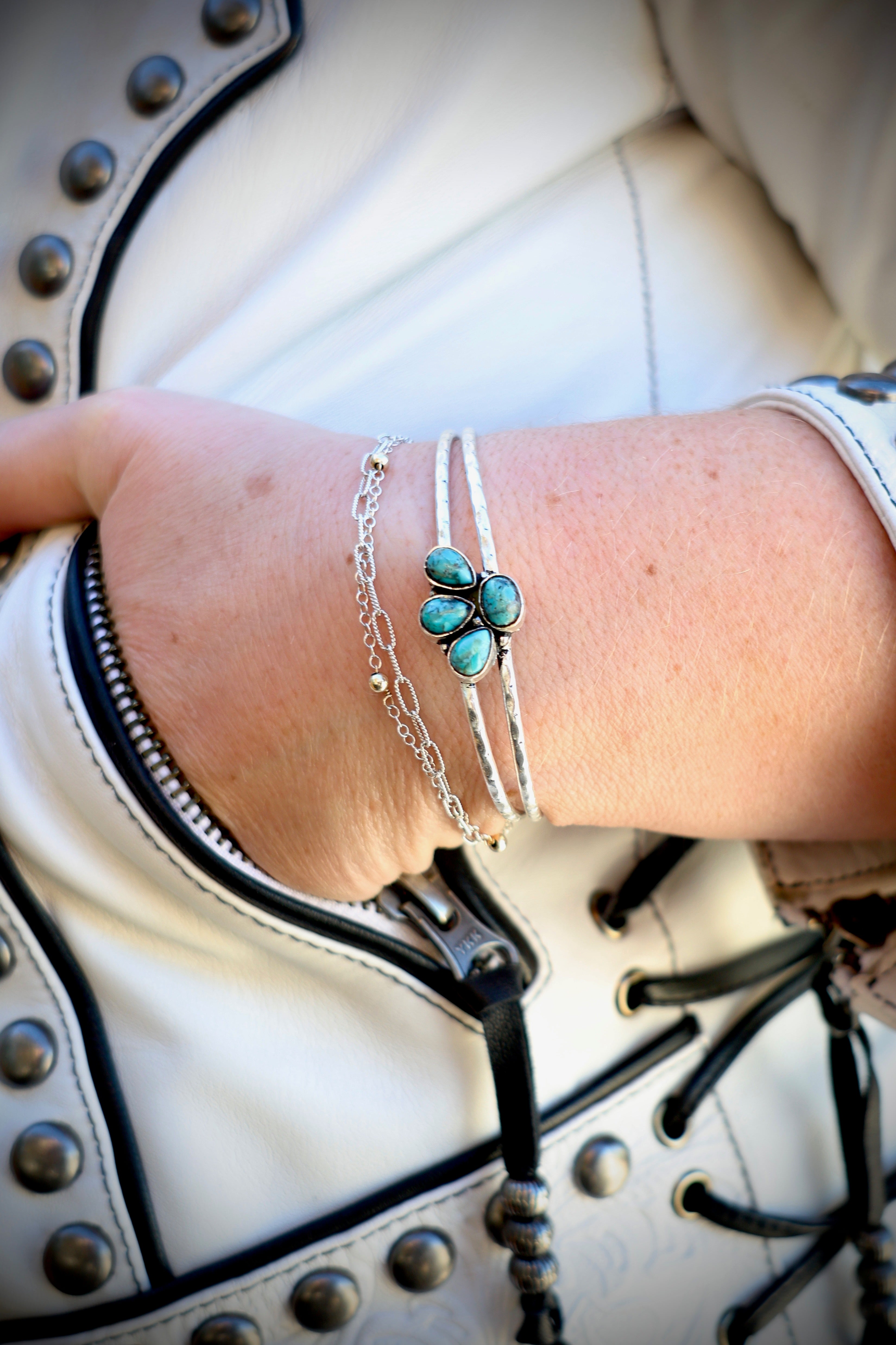 Gorgeous, skinny light weight cuff with four turquoise stones to match the Lainey earrings and choker.