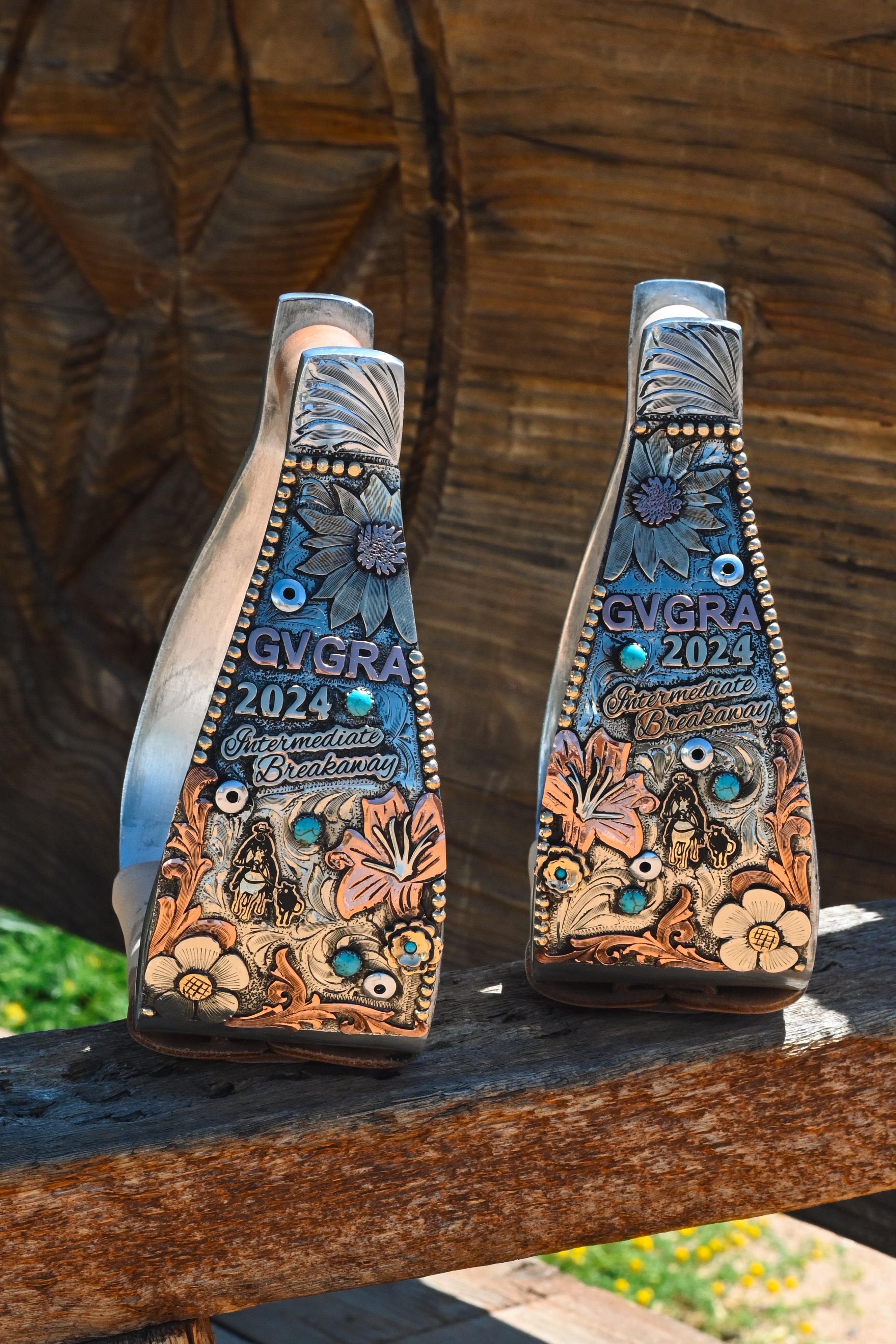Discover the Stirrups Style 14, a 100% unique handmade piece that beautifully blends western elegance with stunning turquoise stones. This customizable fashion accessory allows for personal engraving on silver or copper, making it an extraordinary embellishment. Elevate your style with this one-of-a-kind treasure today!