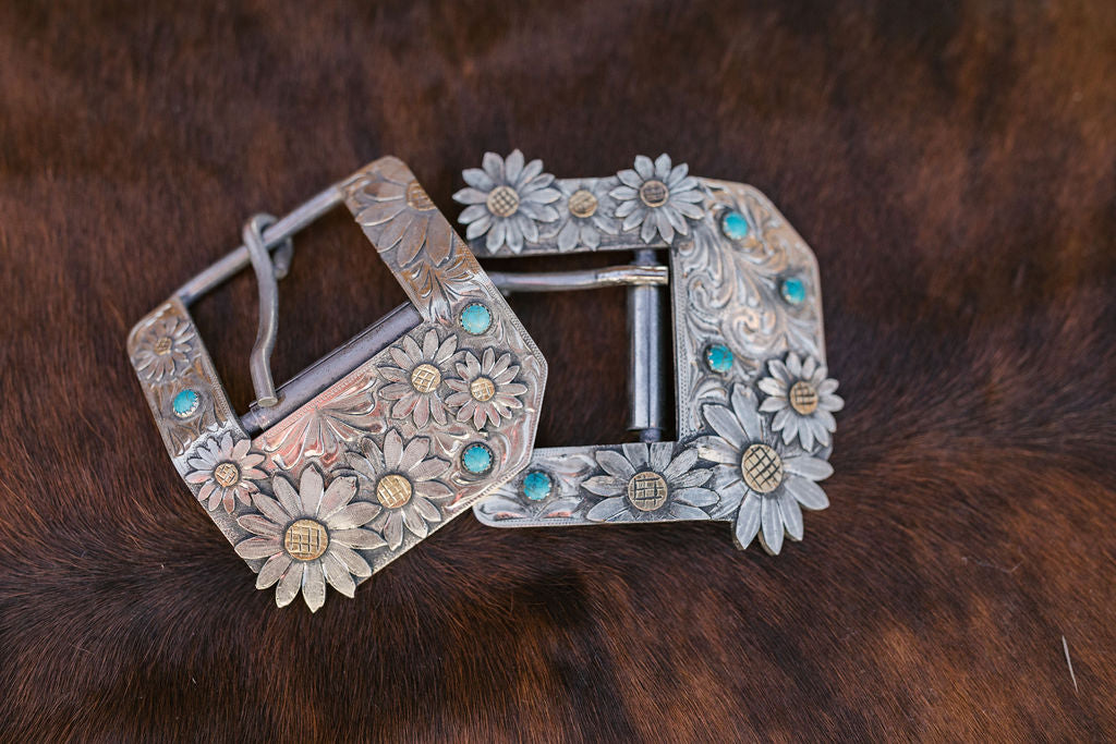 The Katherine Back Cinch Buckles are a unique fusion of western charm and contemporary fashion, adorned with exquisite turquoise stones and intricate engravings. Handmade from silver and copper, these custom pieces boast 100% unique details and embellishments, making them a stylish statement for any outfit.