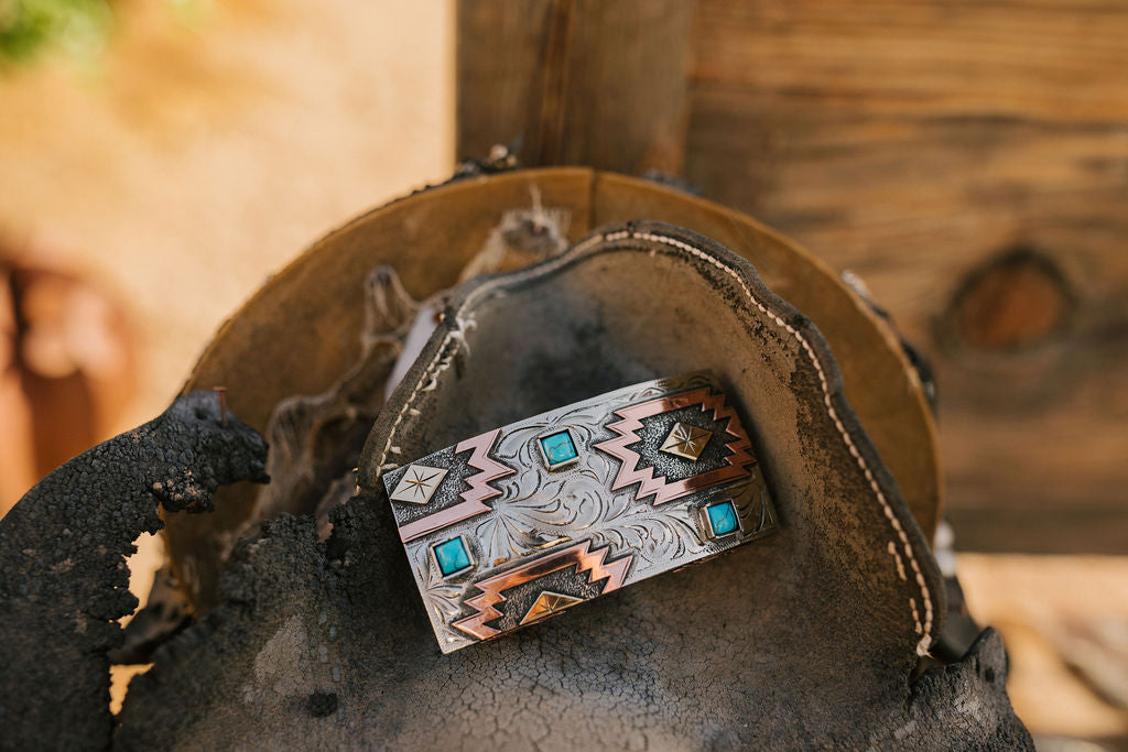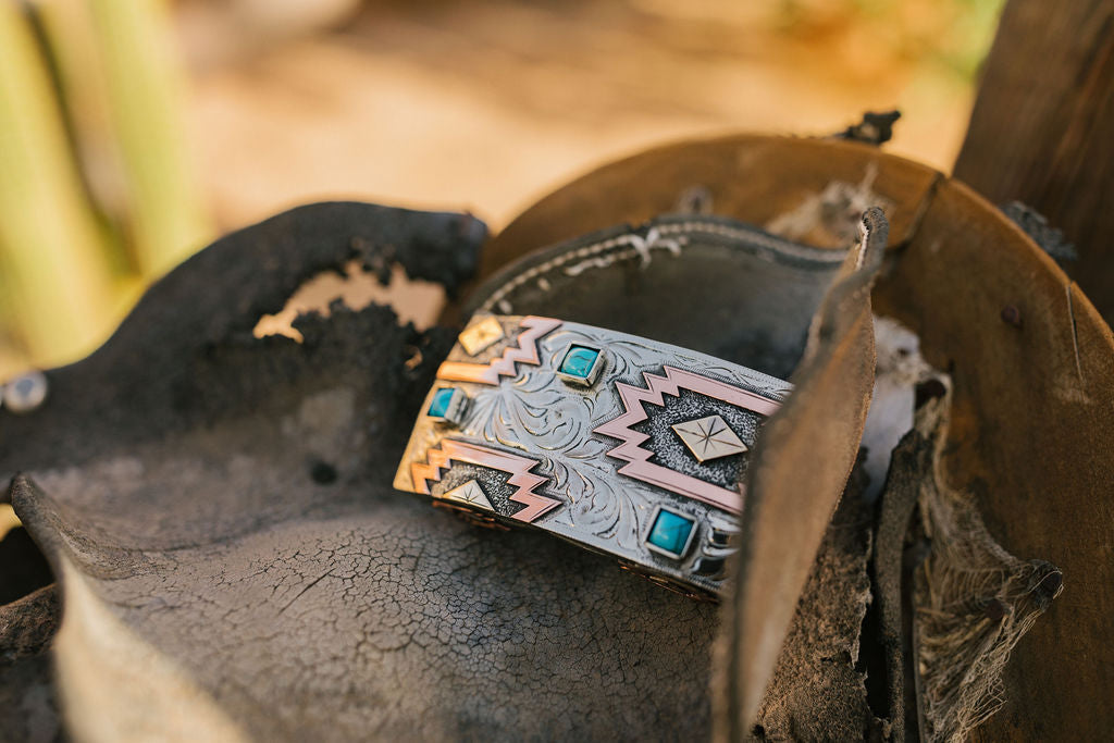 The Cheyenne Belt Buckle is a stunning handmade accessory showcasing western elegance with unique engraving details. Adorned with vibrant turquoise stones, this custom piece combines silver and copper for a fashionable statement. Each buckle is 100% unique, designed to elevate your style and reflect your adventurous spirit.