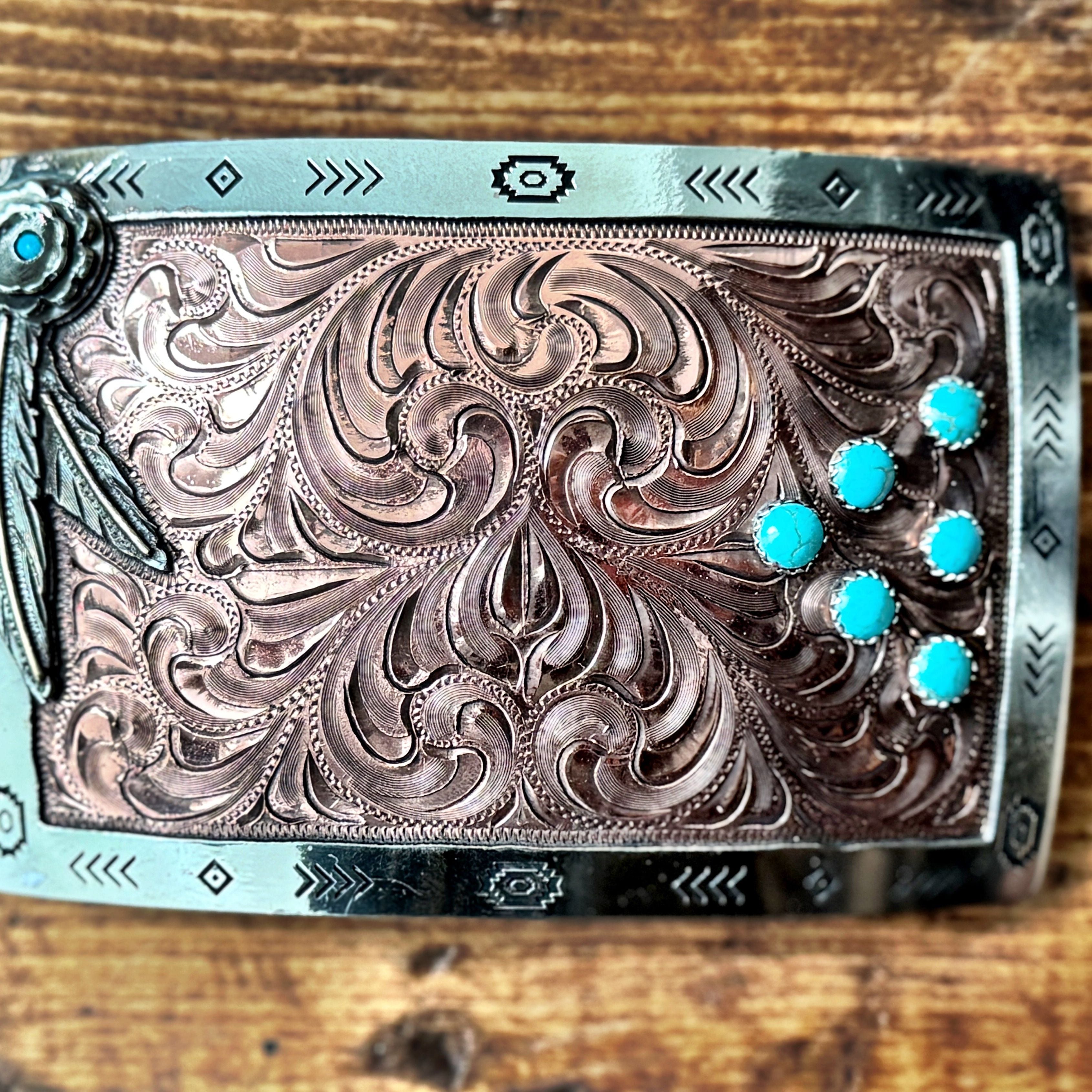 Crafted with care, the Copper and Feather Stock buckle features intricate details and embellishments, showcasing a perfect blend of western flair and stylish elegance. Adorned with turquoise stones, this 100% unique, handmade piece is the ultimate fashion accessory, designed to elevate your look with custom engraving options.