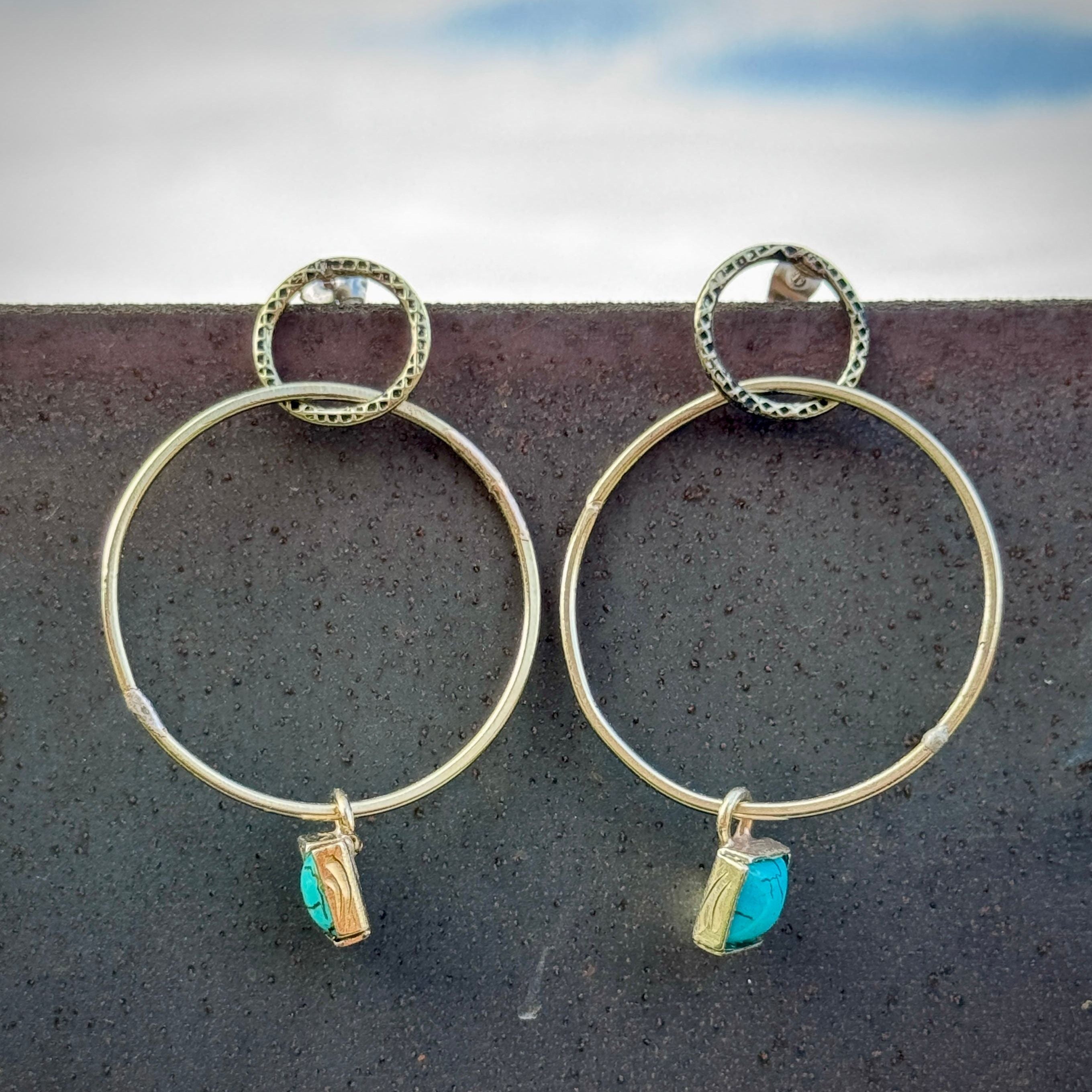 Discover the charm of our Double Hoop Turquoise Stone Earrings, where western flair meets elegance. Handmade with 100% unique turquoise stones, these custom accessories boast intricate silver and copper details, perfect for any fashion-forward individual. Elevate your style with these stunning embellishments that truly stand out.
