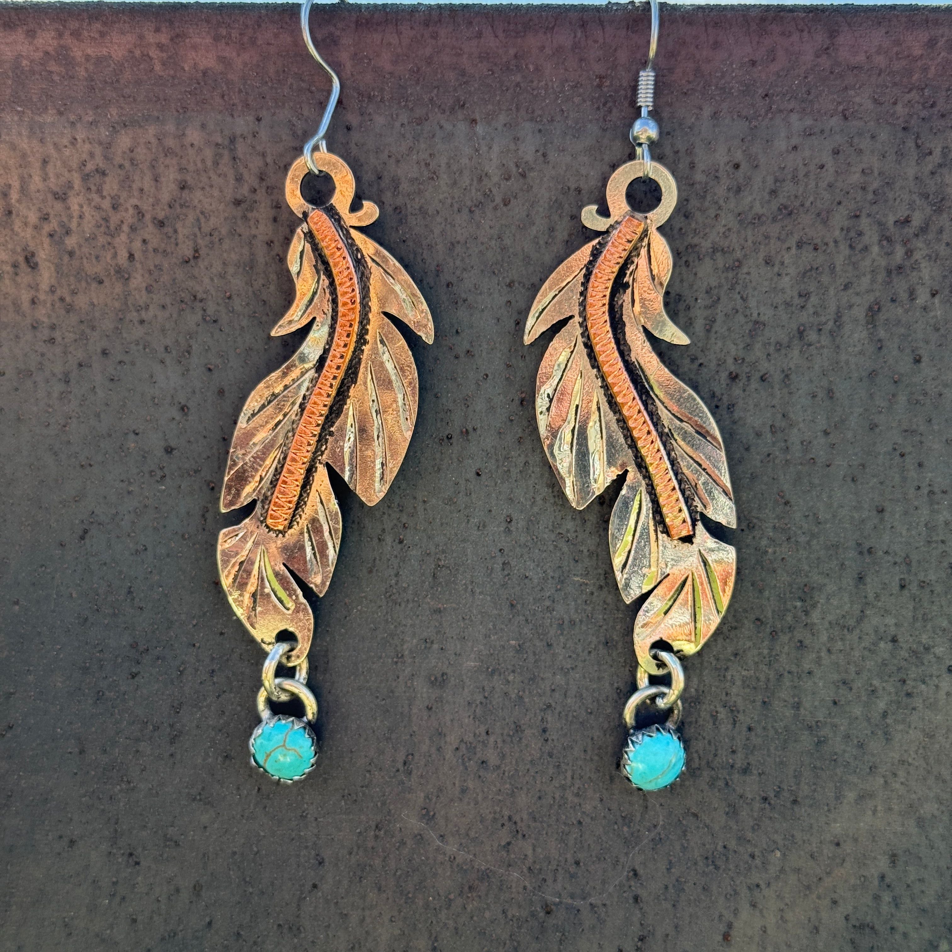 Elevate your style with our Feather Stone Earrings, crafted with stunning turquoise stones and intricate silver and copper details. Each pair is handmade and 100% unique, offering a custom fashion statement that embodies Western elegance. Engraved embellishments add a sophisticated touch to these exquisite earrings.
