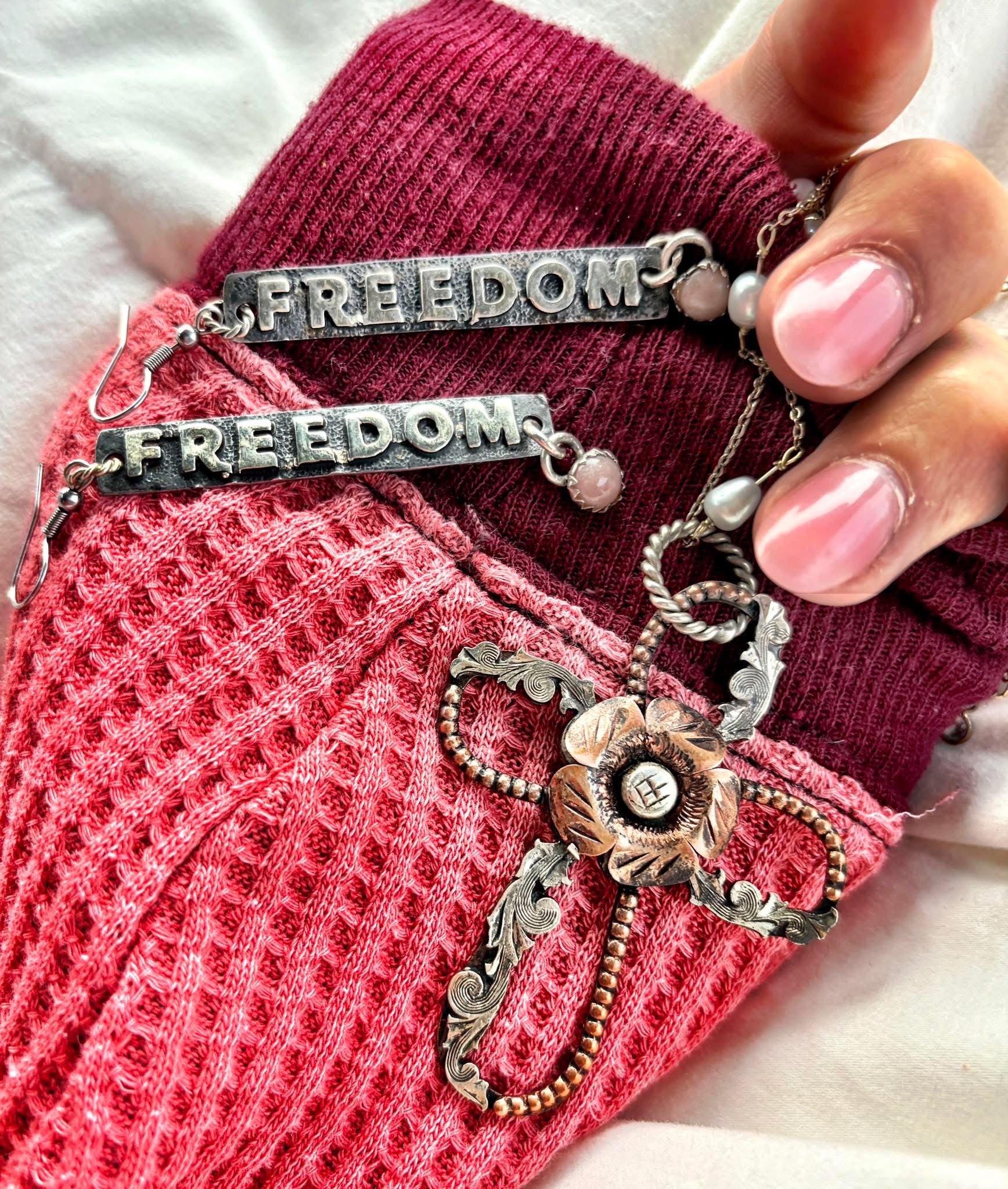 Discover the allure of our Freedom earrings, a stunning blend of western charm and modern elegance. Handcrafted with care, each pair features vibrant turquoise stones, custom engravings, and intricate silver and copper details. 100% unique, these earrings are the perfect fashion statement to express your individuality.