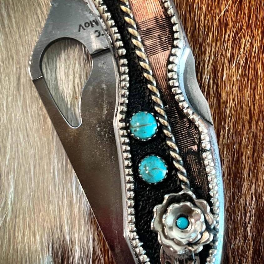 Introducing the Turquoise Knife, a handmade masterpiece featuring a stunning turquoise handle adorned with elegant details. This custom, 100% unique kitchen essential combines fashion and functionality, making it perfect for any chef. With its silver and copper embellishments, this knife enhances your culinary experience while showcasing your distinct style.