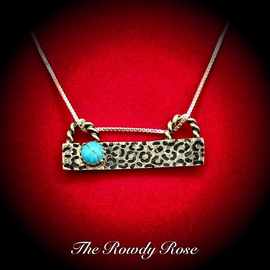 The Cheetah Bar Necklace is a stunning blend of western elegance and wild charm. Handcrafted with intricate details, this 100% unique piece showcases a playful cheetah design, perfect for expressing your fashion sense. Its custom engravings and embellishments make it a standout accessory for any occasion.