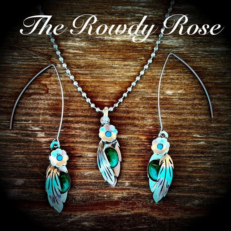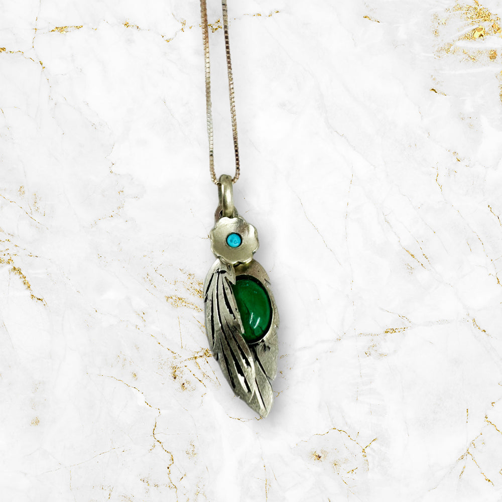 Delicate feather pendant with a flower on top. Featuring turquoise and green stones. Pair perfect with the matching earrings.