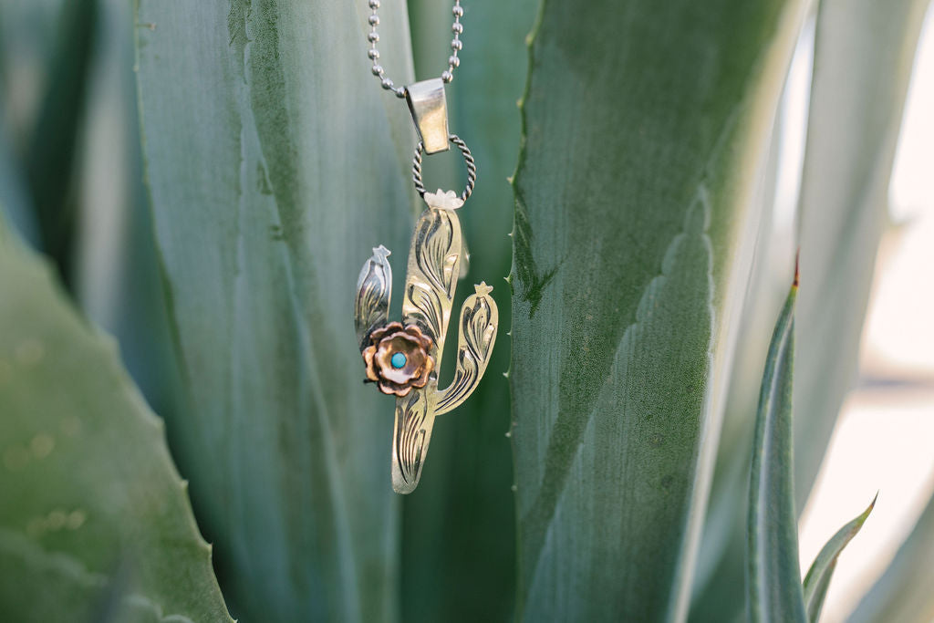 The Saguaro Pendant is a breathtaking piece of custom jewelry, handcrafted with genuine turquoise stones and intricate silver and copper details. This 100% unique pendant features a western-inspired saguaro cactus design, elevating your fashion game with its stunning embellishments and meaningful engraving. Perfect for any occasion!