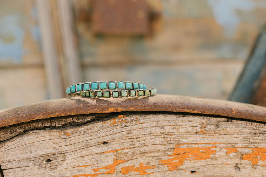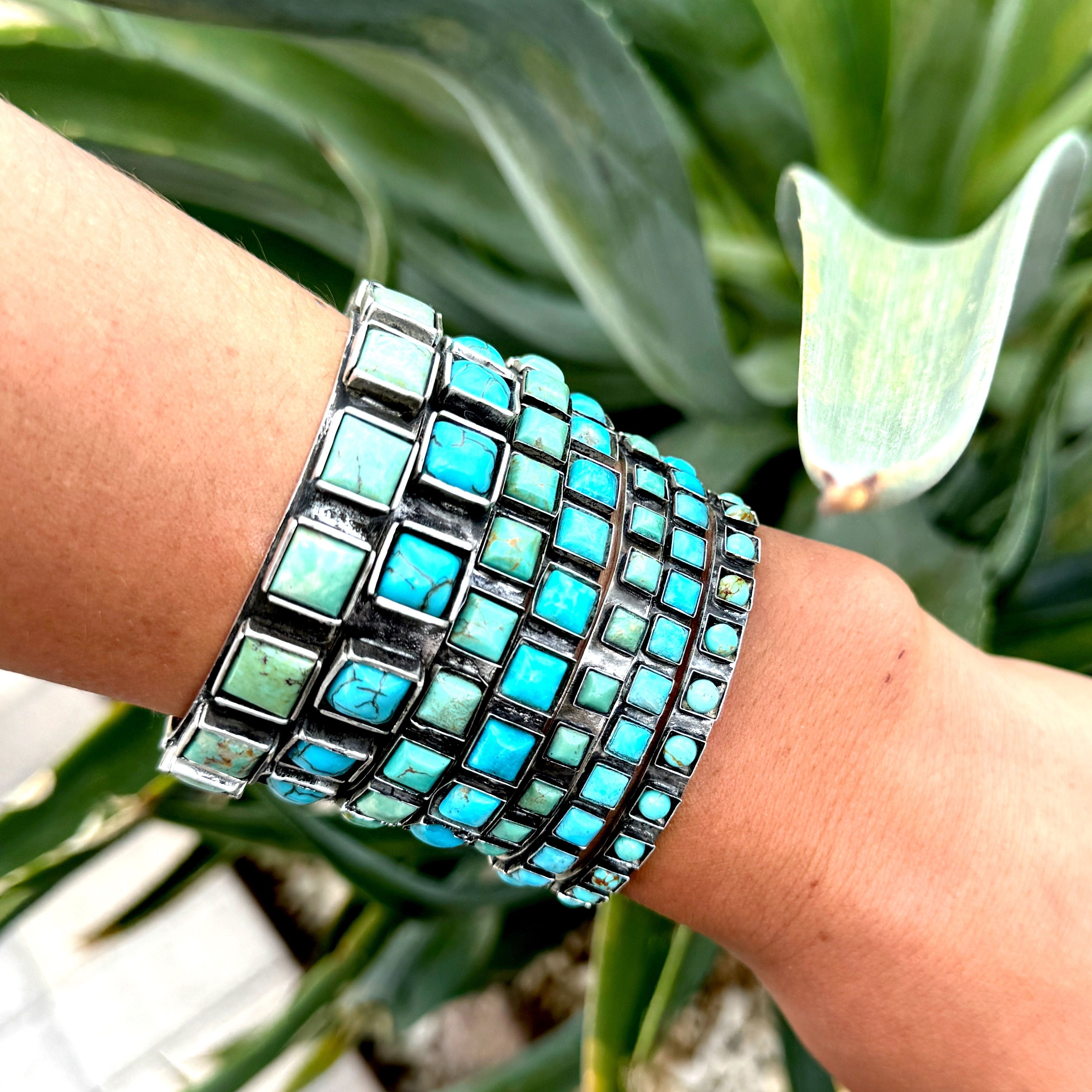 These stunning turquoise stone bracelets are handmade with real Kingman Turquoise and elegant silver, embodying western flair and unique fashion. Each piece features custom engravings and intricate details, making them 100% unique embellishments for any outfit. Elevate your style with these eye-catching accessories.