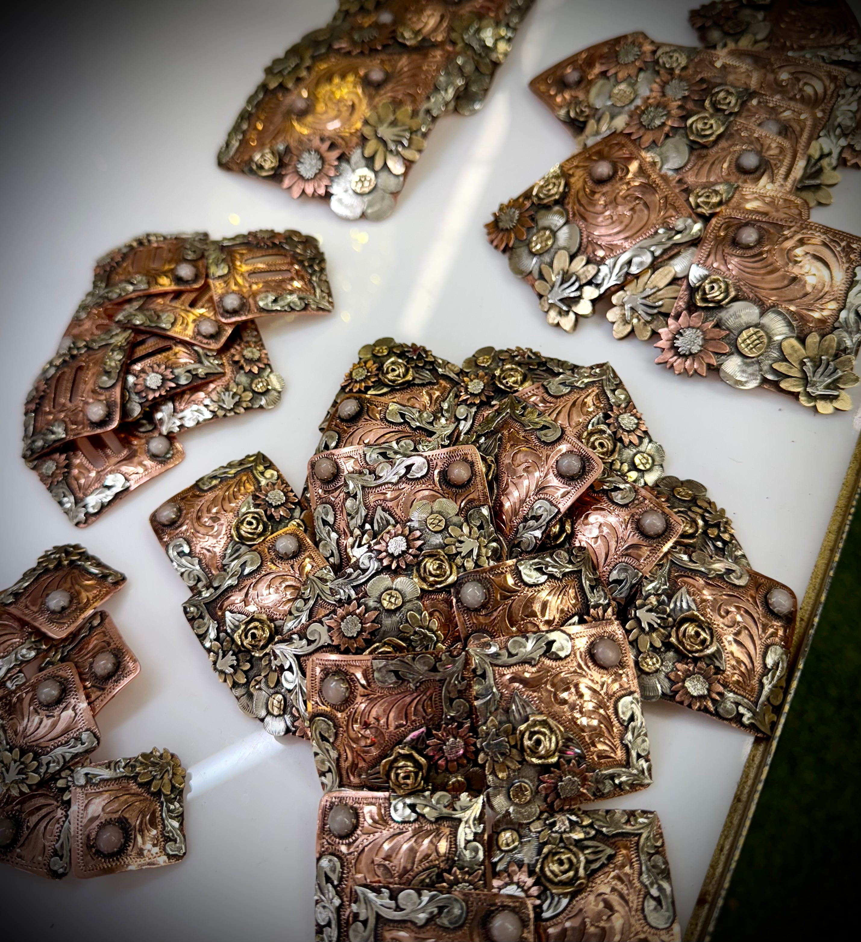 Experience the charm of the Audrey Conchos, a fusion of western flair and modern elegance. Each handmade piece features stunning turquoise stones and intricate engravings, ensuring it's 100% unique. Crafted from silver and copper, these custom embellishments are perfect for fashion-forward individuals looking to make a statement.