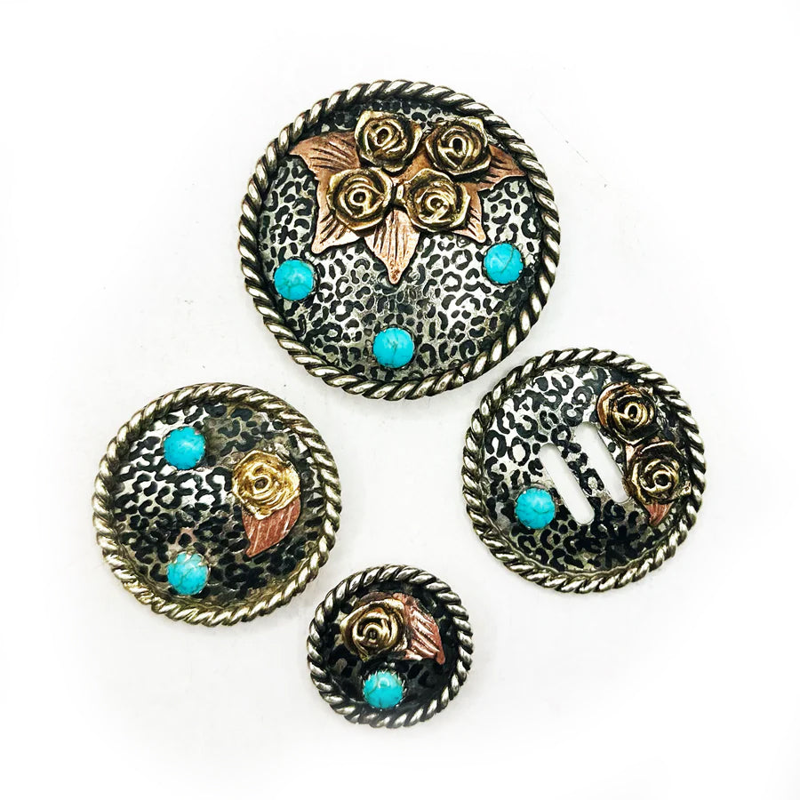 Saddle up in style with the Charley Conchos, featuring vibrant turquoise stones that add a unique touch to your western fashion. Handmade with exquisite details, these custom pieces are crafted from silver and copper, ensuring you stand out at any rodeo or casual event. Feel confident and adventurous wearing these 100% unique embellishments!