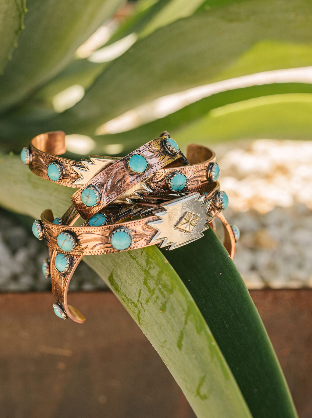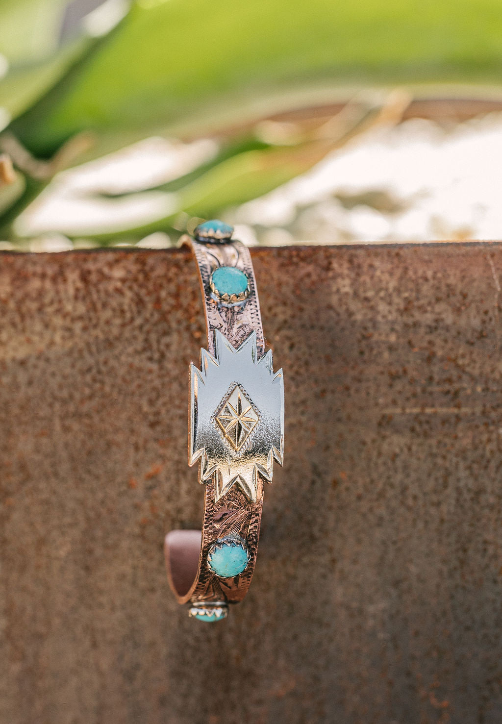Discover the exquisite Dakota Bracelet, a handmade treasure featuring striking turquoise stones and intricate silver and copper details. Each custom piece is 100% unique, embodying western charm with elegant embellishments. Perfect for any fashion enthusiast, this bracelet will elevate your style and make a memorable statement.