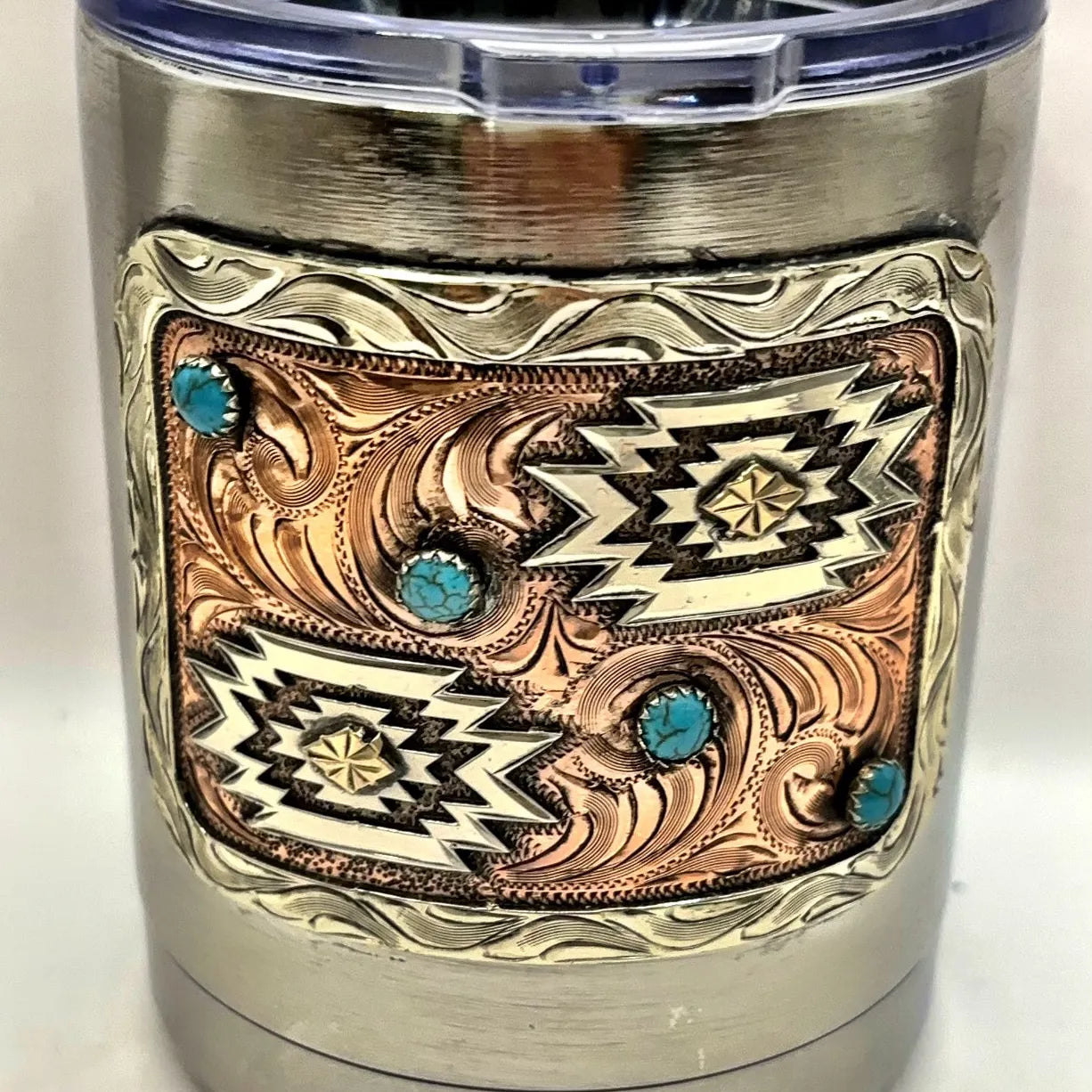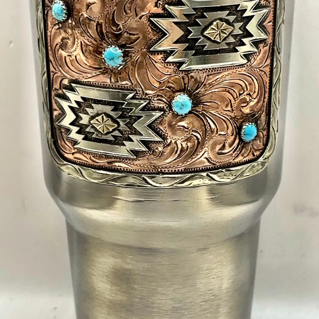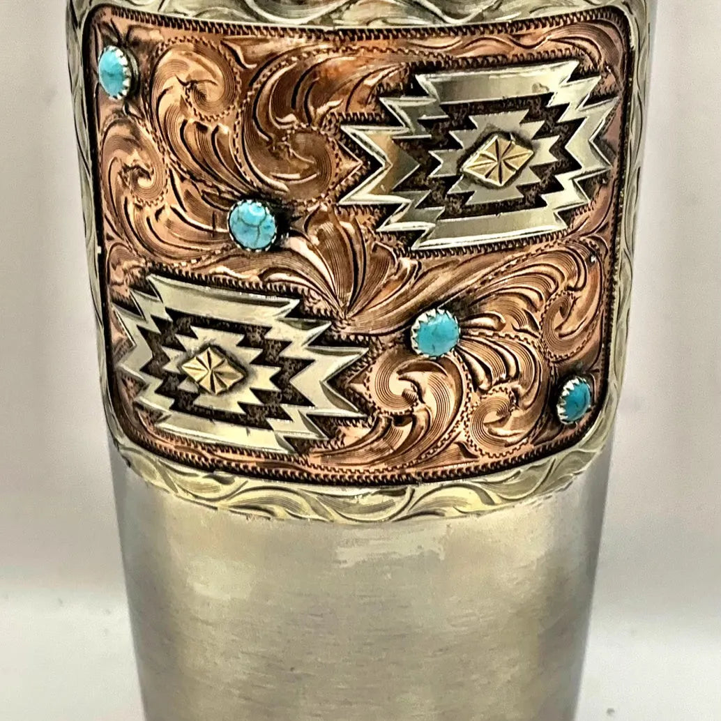 Experience the charm of the Dakota Tumbler, a 100% unique, handmade piece featuring exquisite turquoise stones and intricate silver and copper embellishments. This custom fashion statement combines artistry with functionality, perfect for sipping your favorite drinks while showcasing stunning engraved details that tell a story with every use.