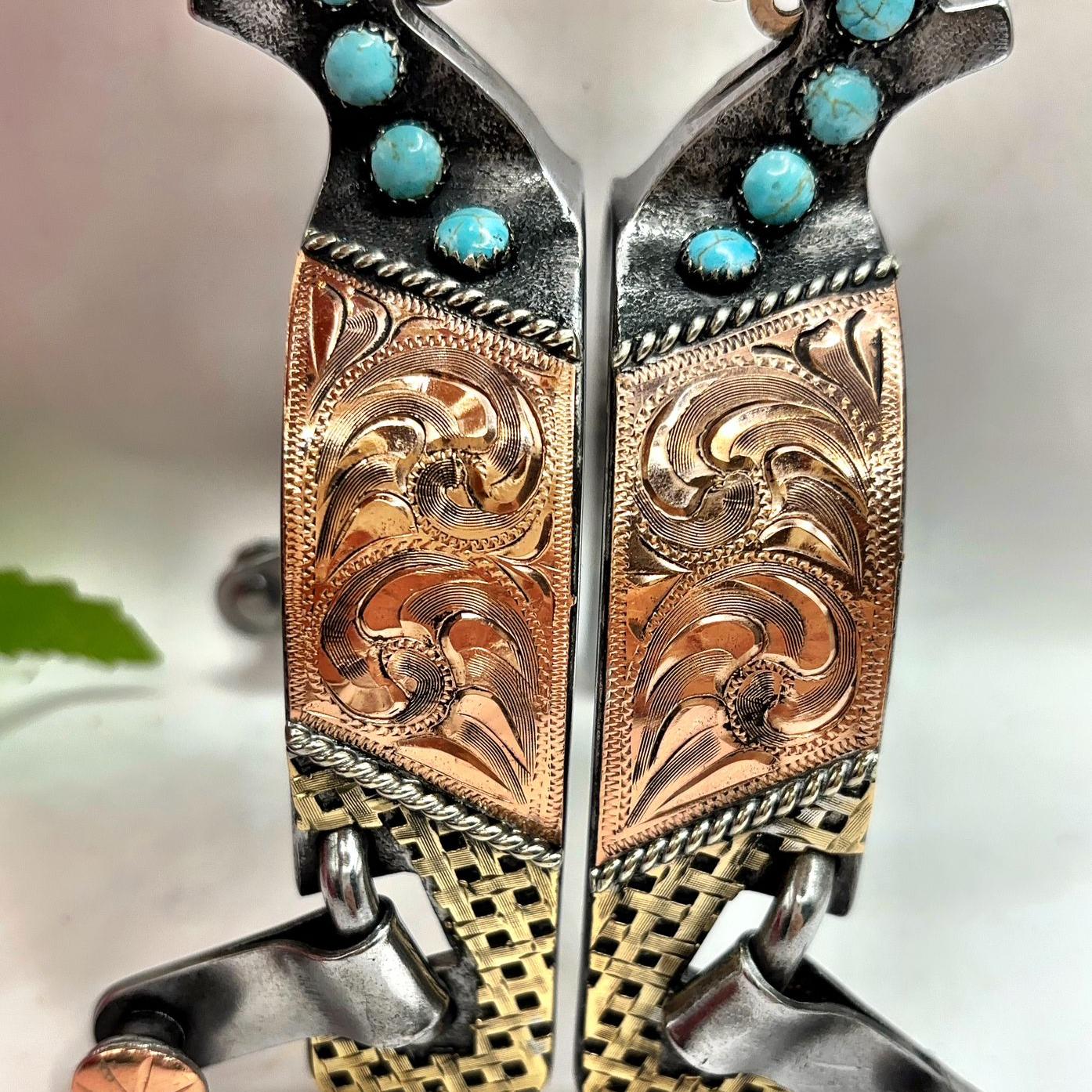 Introducing our stunning Lattice Spurs, handcrafted for the discerning cowboy. These western-inspired spurs feature exquisite turquoise stones and intricate engraving, ensuring each piece is 100% unique. Made from durable silver and copper, they showcase detailed embellishments that elevate your fashion statement. Perfect for any occasion, order your custom pair today!
