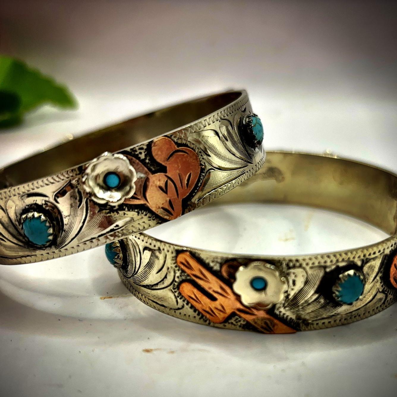 The Santa Fe Bangle is a handmade, 100% unique piece that showcases western elegance with stunning turquoise stones and intricate engraving. Crafted from silver and copper, it features exquisite details and embellishments, making it a fashionable statement for any occasion. Embrace your individuality with this enchanting accessory.