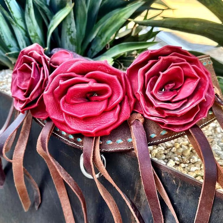 Experience the allure of the West with the Turquoise Buckstitch Red Rose Tripping Collar. This 100% unique, handmade collar features stunning turquoise stones and exquisite silver and copper details. Custom engravings and embellishments make it a true fashion statement, perfect for your beloved pet. Elevate their style today!