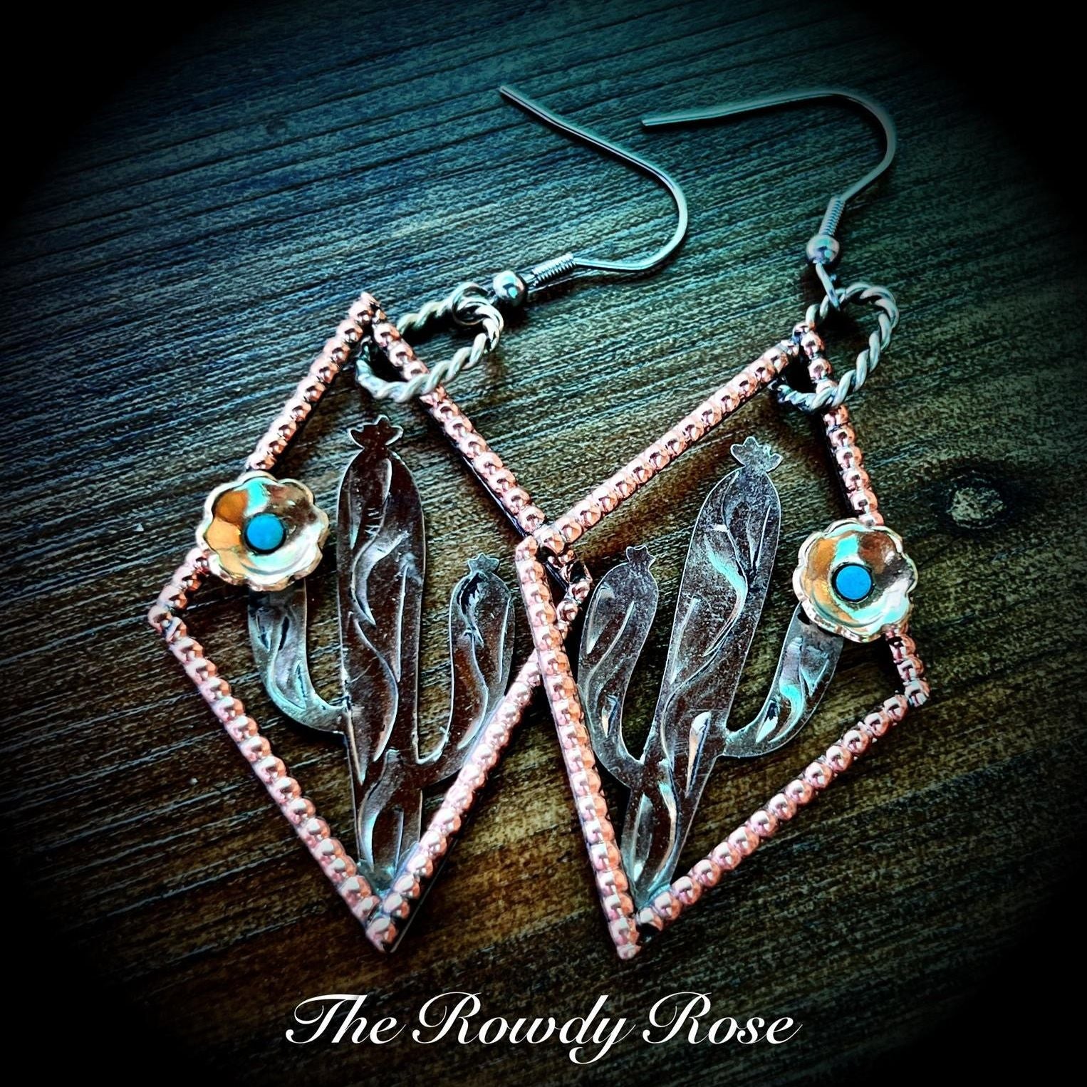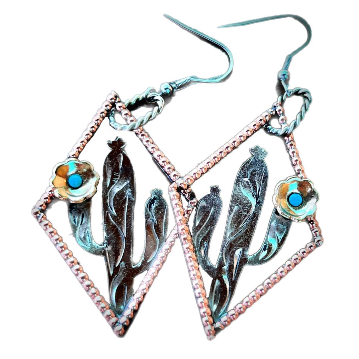 The Turquoise Cactus Earrings are handmade treasures featuring stunning turquoise stones and intricate silver and copper details. These 100% unique pieces embrace a western flair with custom engravings and delightful embellishments, making them the perfect fashion accessory to elevate any outfit with a charming touch of nature-inspired elegance.