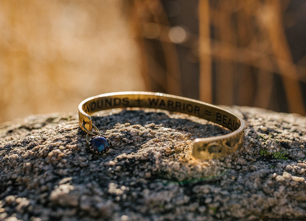 The Wounds + Warrior Kelly Quote Bracelet is a striking piece that embodies resilience and strength. Crafted with care, its sleek design features a delicate band that gently wraps around your wrist, evoking a sense of empowerment with every wear. The engraved quote serves as a daily reminder of courage, inviting you to embrace life's challenges with a warrior's spirit. This beautiful bracelet not only adds a touch of elegance to any outfit but also connects you to a greater narrative of healing and perseverance, making it a meaningful accessory for anyone seeking inspiration.