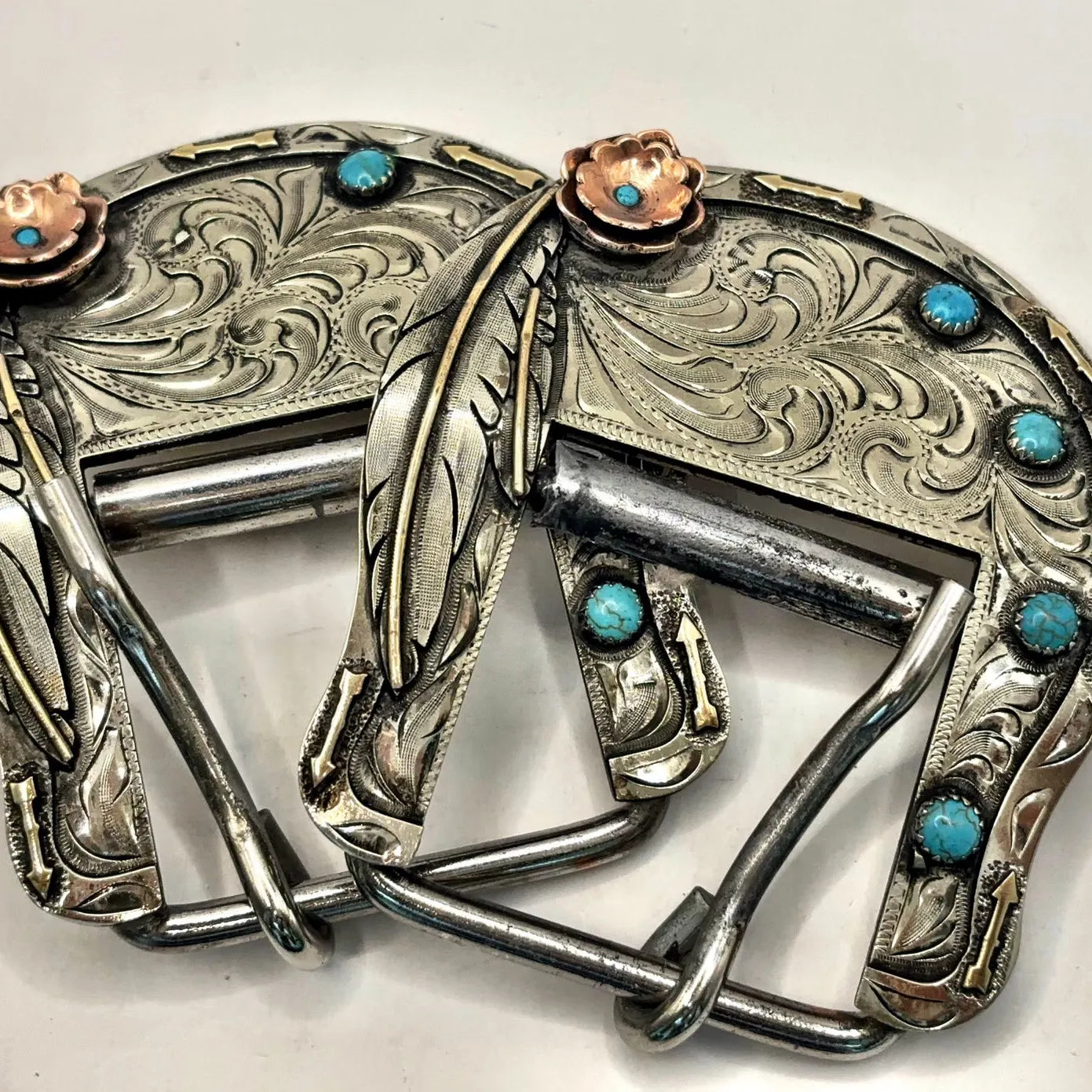 The Wynona Back Cinch Buckles are a stunning fusion of western charm and modern fashion, featuring intricate silver and copper details, 100% unique engravings, and embellished with beautiful turquoise stones. Handmade with care, these custom accessories elevate any outfit into a statement piece, perfect for any occasion.