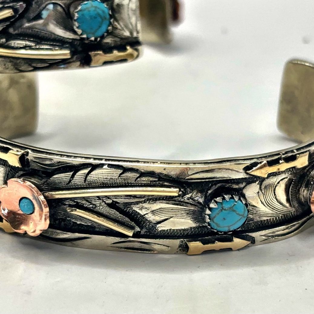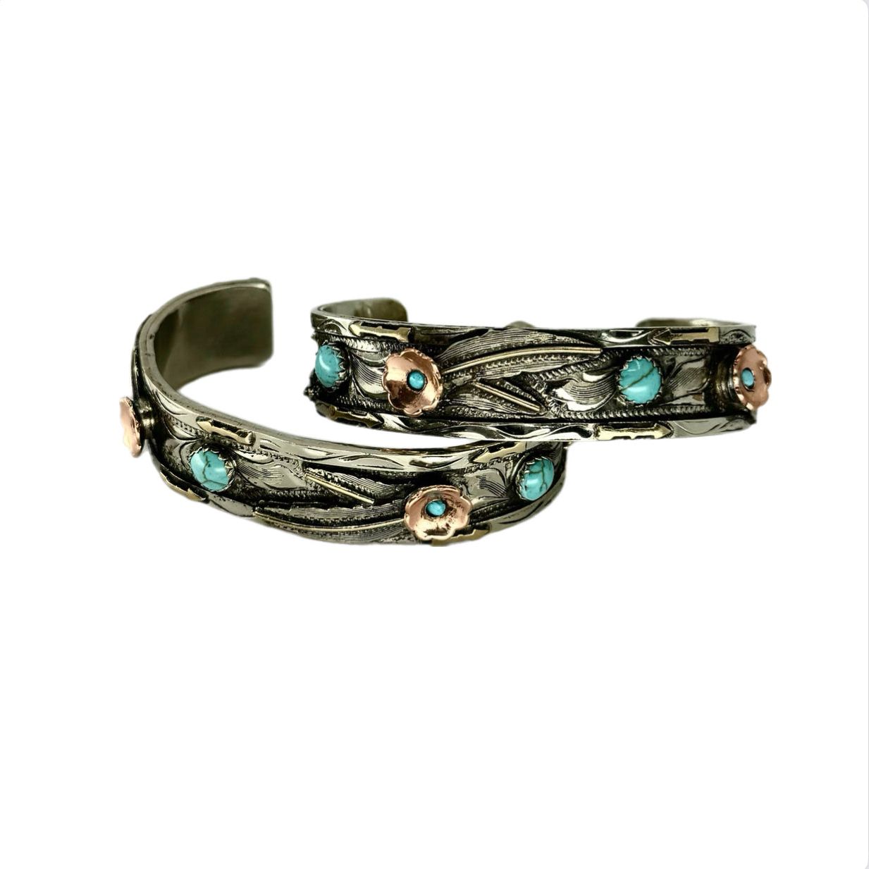 The Wynona Bracelet is a handcrafted masterpiece blending western charm with exquisite turquoise stones and intricate silver and copper details. Each piece is 100% unique and customizable, making it the perfect fashion statement. Adorned with beautiful engravings and embellishments, this bracelet is a must-have accessory for any occasion.