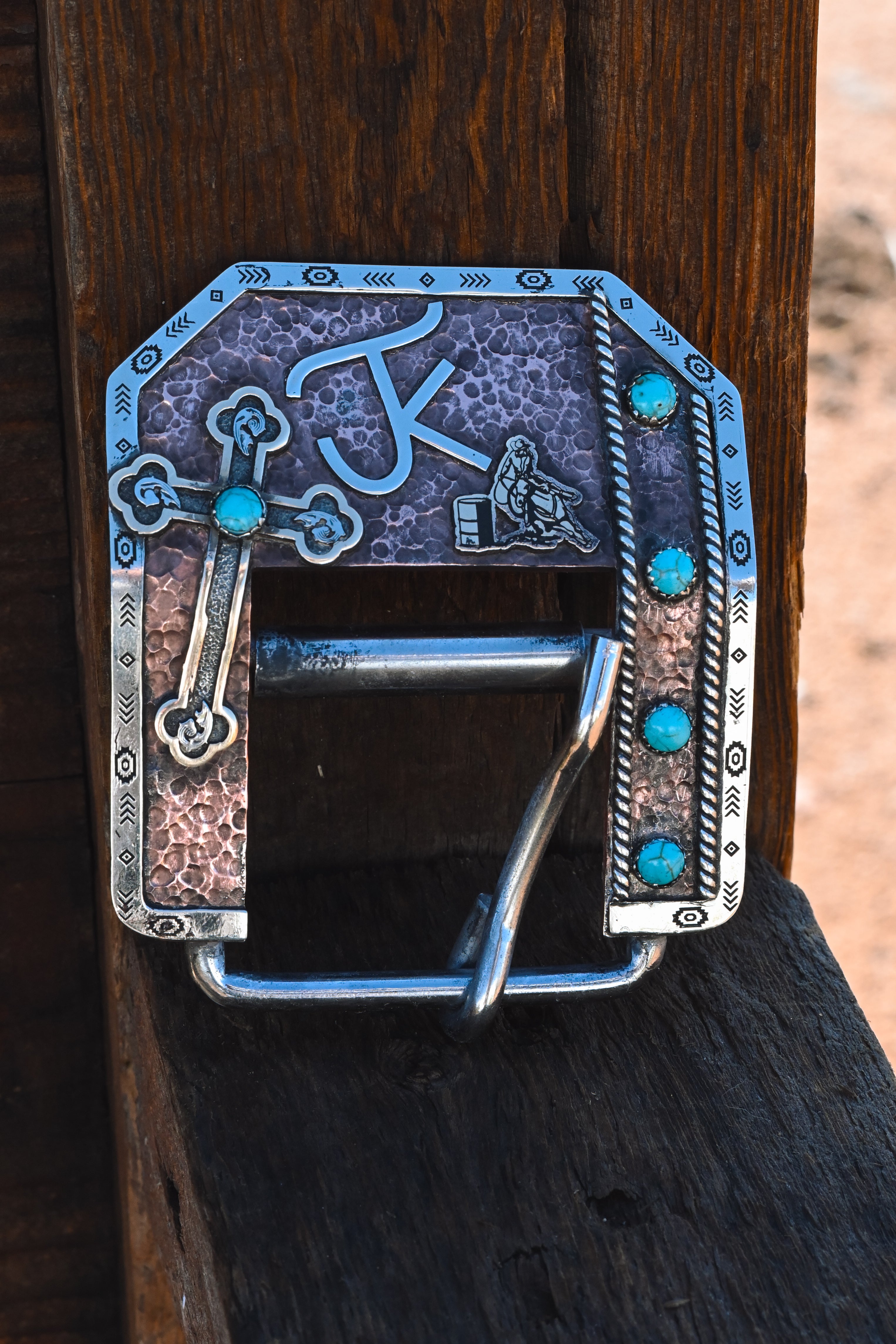 Elevate your look with Back Cinch Style 11, a stunning blend of western elegance featuring captivating turquoise stones and detailed silver and copper embellishments. Each handmade, custom piece is 100% unique, perfect for showcasing your personal fashion statement. Make this exquisite buckle yours today!