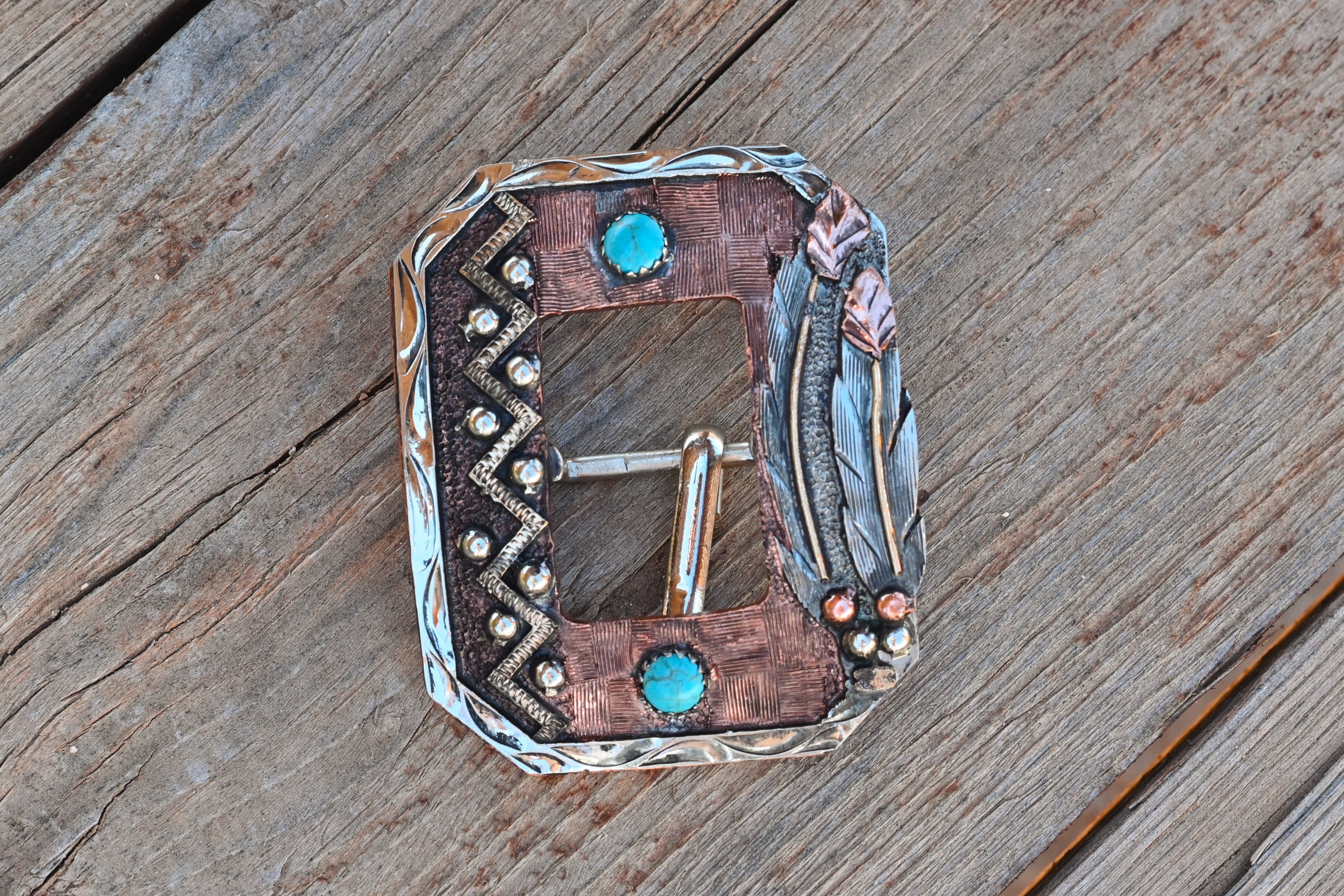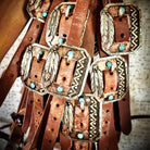 Add a touch of western elegance with the Pendleton Cart Buckle, featuring vibrant turquoise stones and intricate designs. This handmade, custom accessory showcases unique engravings and embellishments in silver and copper, making it a 100% unique fashion statement for your tack set. Transform your style today!