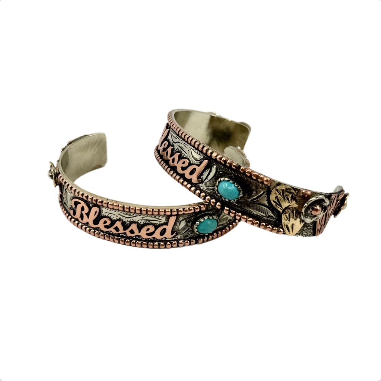 The Blessed Bracelet is a stunning handmade accessory featuring unique turquoise stones, intricate silver and copper details, and custom engravings. Each piece is 100% unique, embodying a fashionable western charm that effortlessly enhances any outfit while serving as a beautiful reminder of gratitude and positivity.