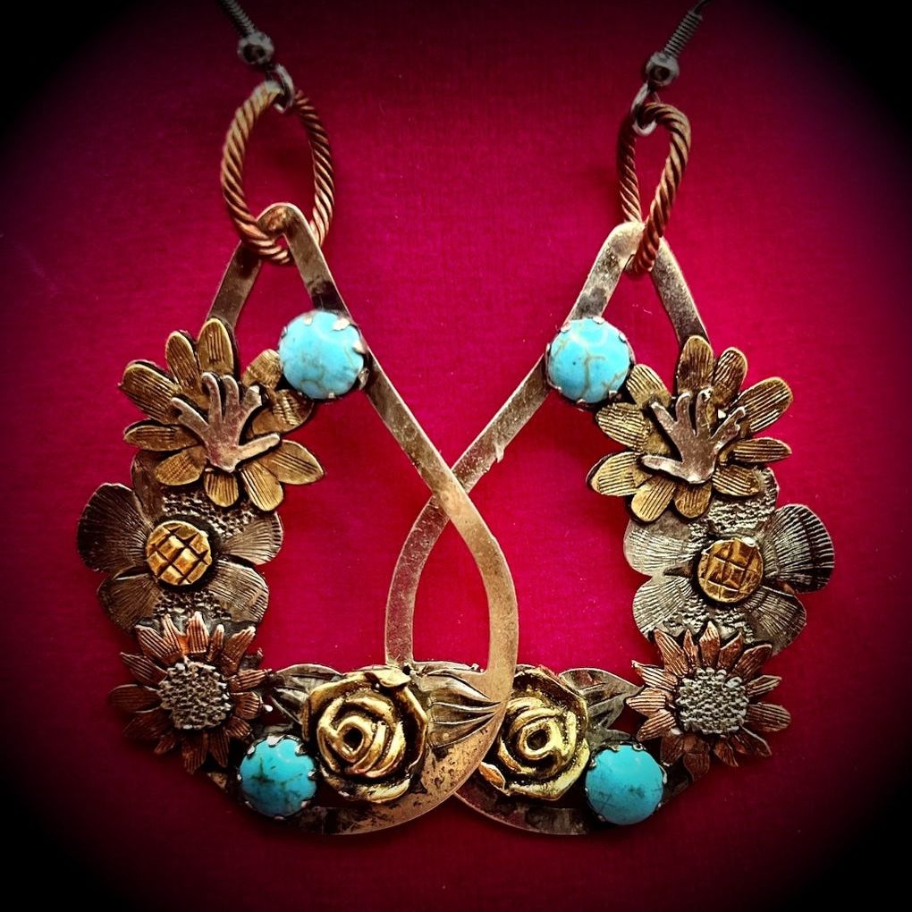 Discover the elegance of our Clementine Teardrop Earrings, featuring stunning turquoise stones set in a custom silver and copper design. Each pair is 100% unique and handmade, showcasing intricate details and embellishments. Perfect for any western-inspired fashion enthusiast, these earrings effortlessly blend style and sophistication.