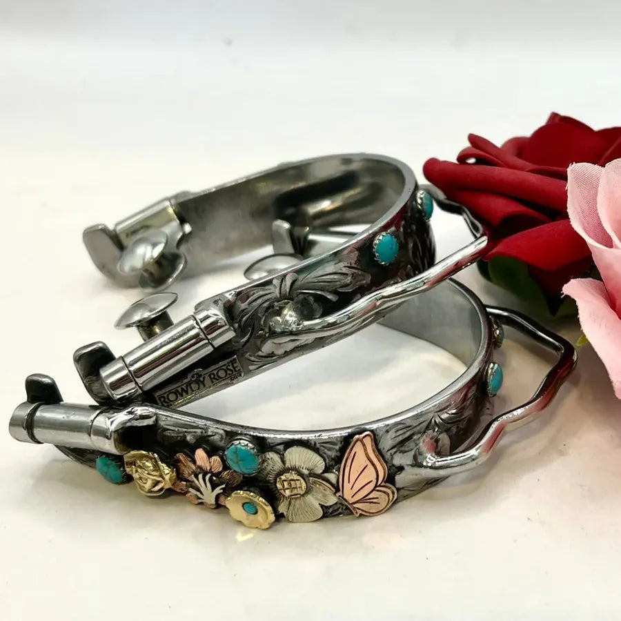 Elevate your western style with the Janice Bumper Spurs, handcrafted and adorned with stunning turquoise stones. Each pair is a 100% unique creation, featuring exquisite silver and copper details that reflect custom engraving and intricate embellishments. Perfect for fashion-forward equestrians, these spurs are designed to make a statement and enhance your riding experience. Don’t miss out on this essential addition to your collection!