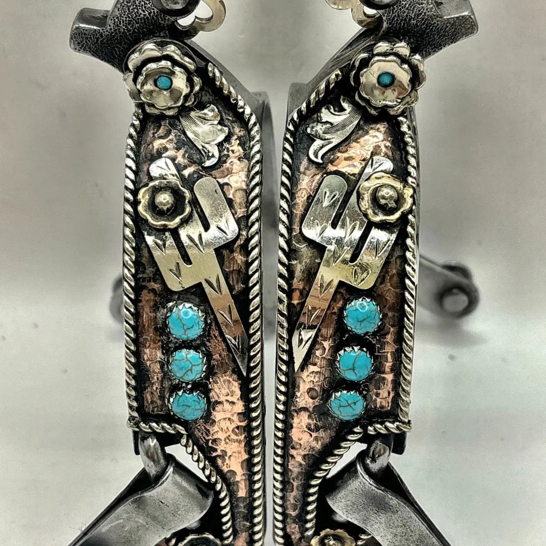 Elevate your western style with the Mesa Spurs, handmade and 100% unique. Adorned with exquisite turquoise stones and detailed engraving, these custom spurs are a perfect fusion of fashion and function. Crafted from durable silver and copper, they add a touch of adventure to every ride.