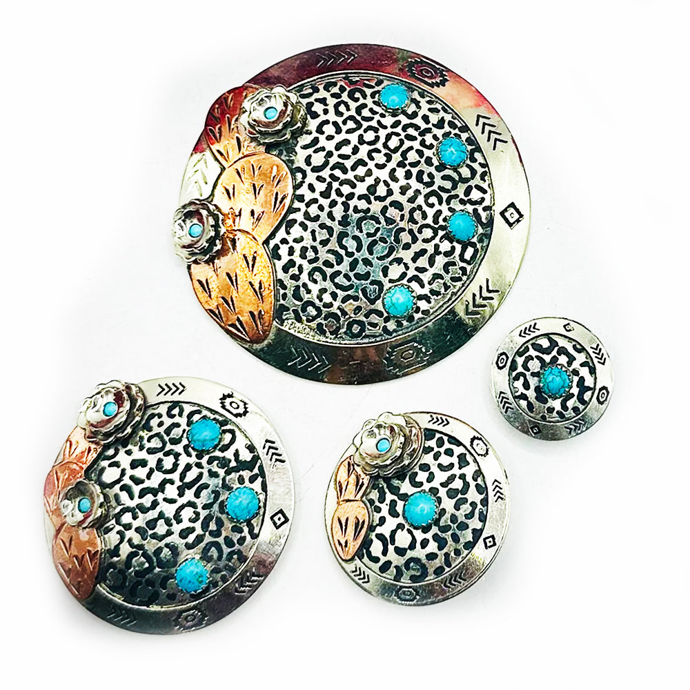 Discover the Stella Conchos, where western charm meets 100% unique handmade artistry. Adorned with stunning turquoise stones and intricate silver and copper engravings, each custom piece showcases exquisite details and embellishments, making them the perfect fashion statement for any occasion. Elevate your style effortlessly with these captivating accessories.